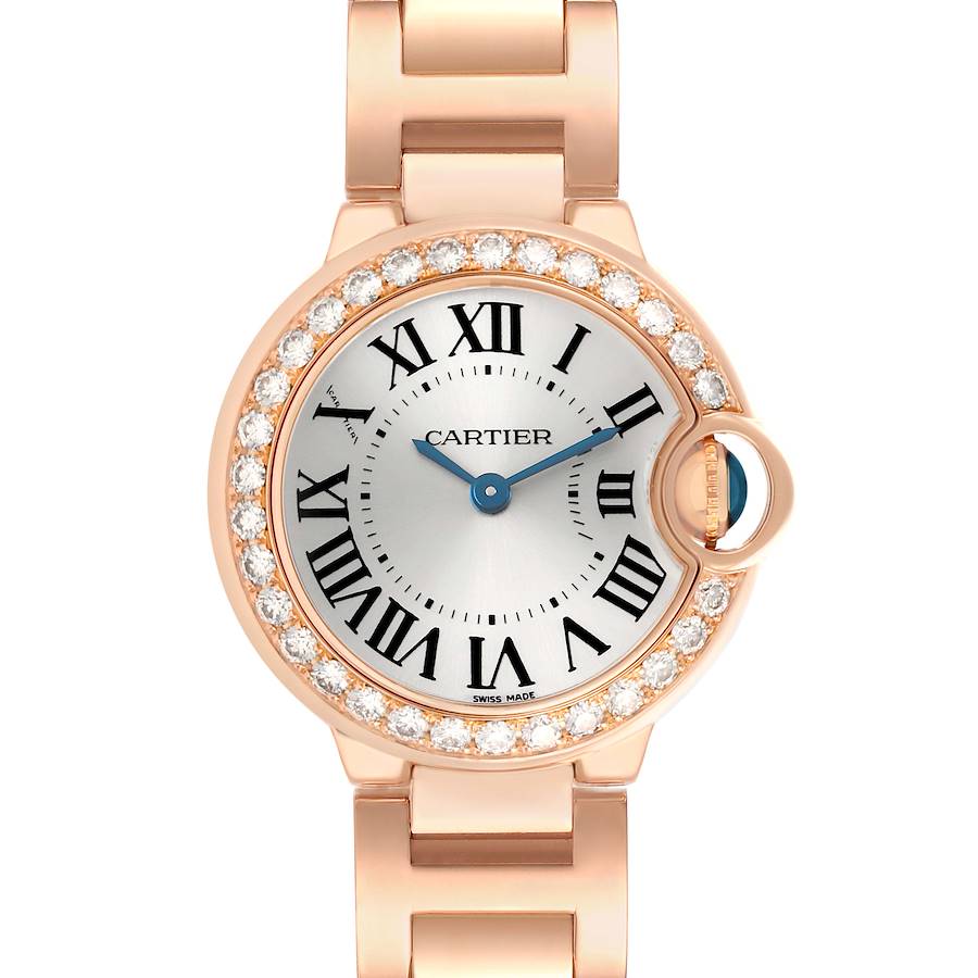 Cartier Ballon Bleu 29 Rose Gold Diamond Ladies Watch WE9002Z3. Quartz movement. Caliber 057. 18K rose gold round case 29.0 mm in diameter. Fluted crown set with the blue sapphire cabochon. 18K rose gold original Cartier factory diamond bezel. Scratch resistant sapphire crystal. Silver opalined lacquered dial with painted Roman numeral hour markers and blued steel sword-shaped hands. An inner minute track. Secret Cartier signature at X. 18K rose gold bracelet with a hidden double deployant clasp. Fits a 6" wrist.