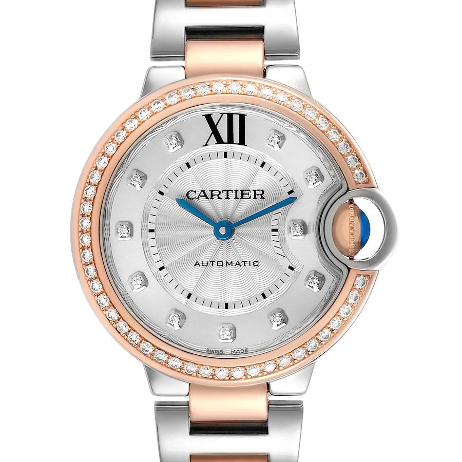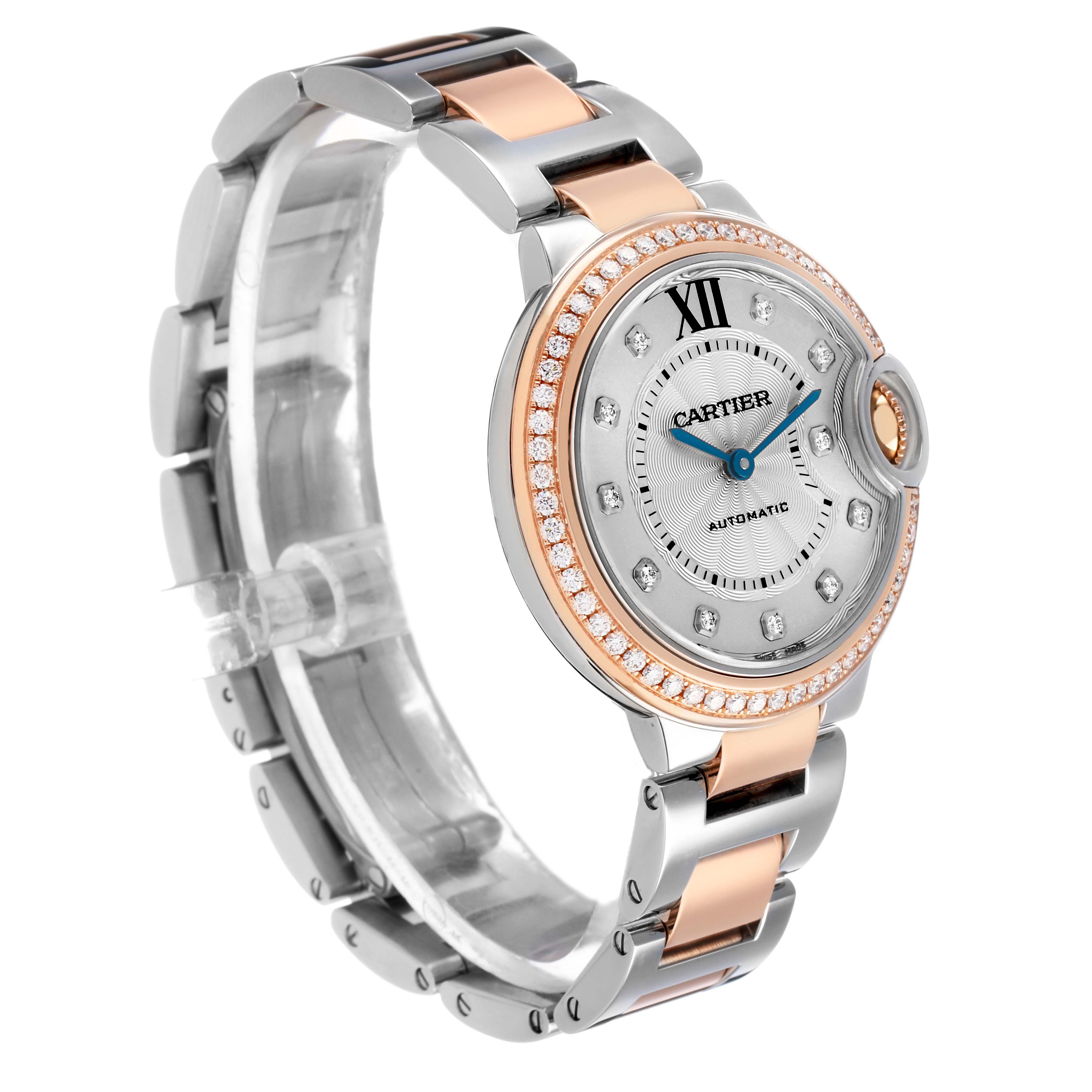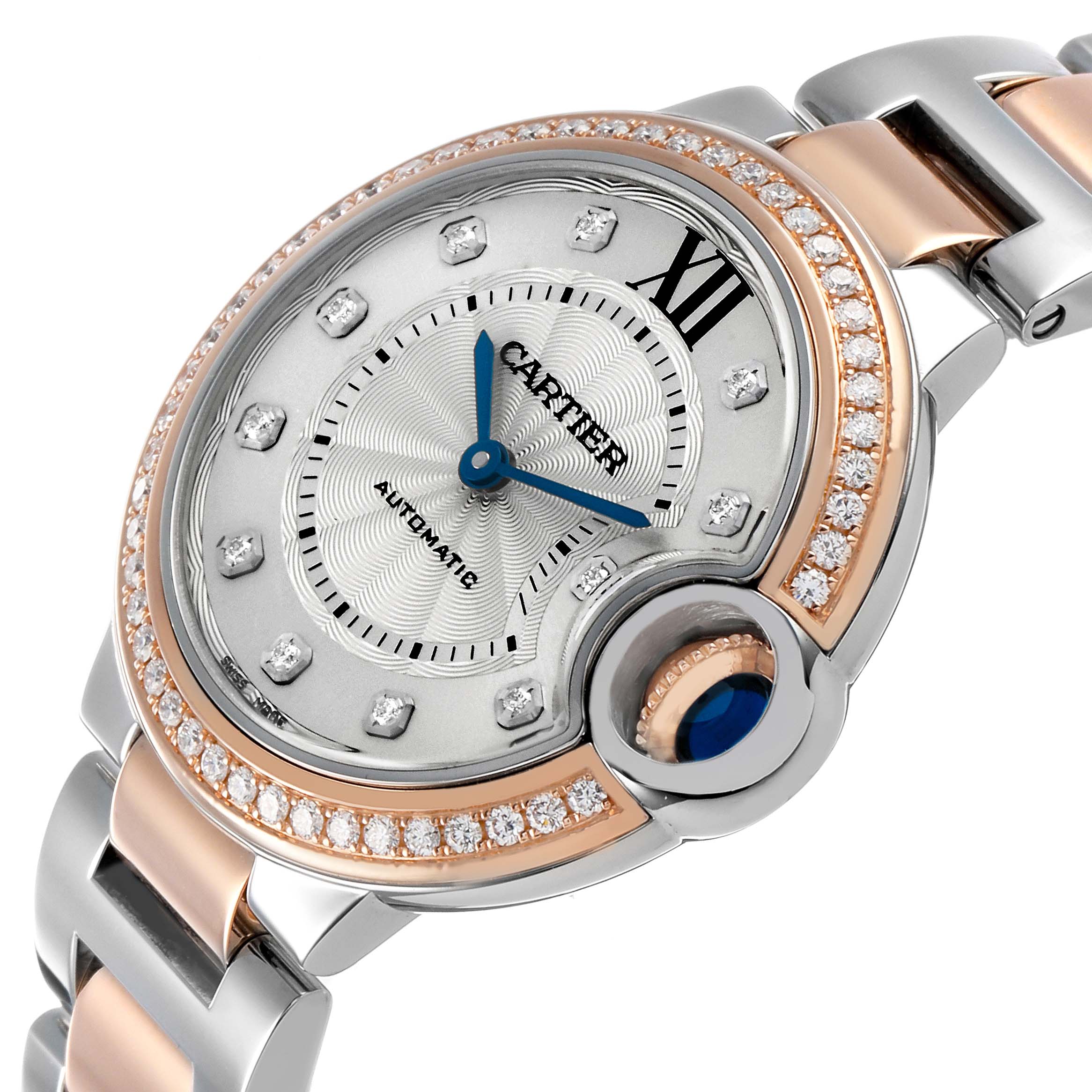 Cartier Ballon Bleu 33 Diamond Dial Steel Rose Gold Ladies Watch WE902077 Card. Automatic self-winding movement. Round stainless steel and 18k rose gold case 33.0 mm in diameter. Fluted crown set with the blue spinel cabochon. 18k rose gold original Cartier factory diamond bezel. Scratch resistant sapphire crystal. Silvered guilloche dial with original Cartier factory diamond hour markers and an inner minute track. Blue sword-shaped hands. Stainless steel and 18k rose gold bracelet with a hidden clasp. Fits a 6.5" wrist.