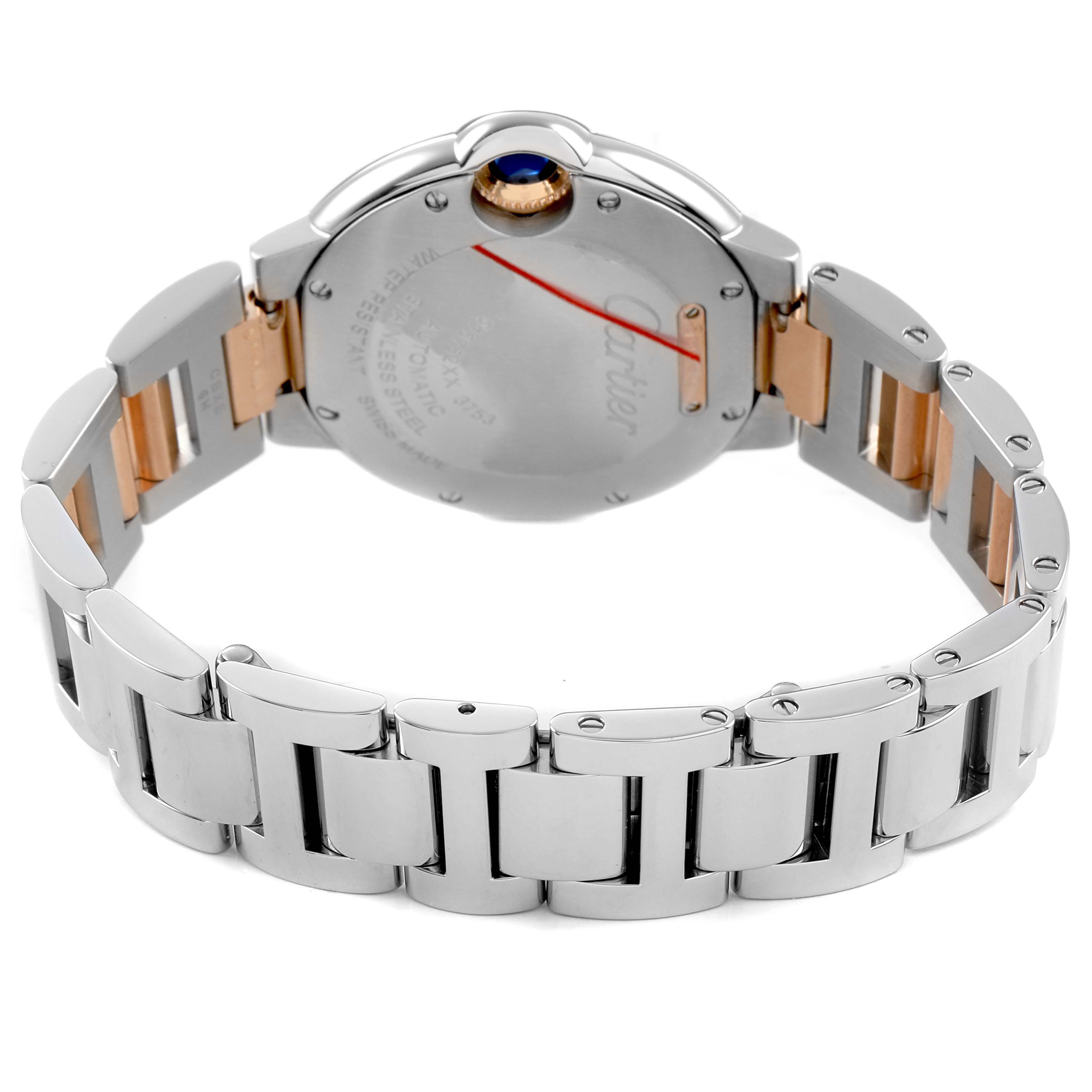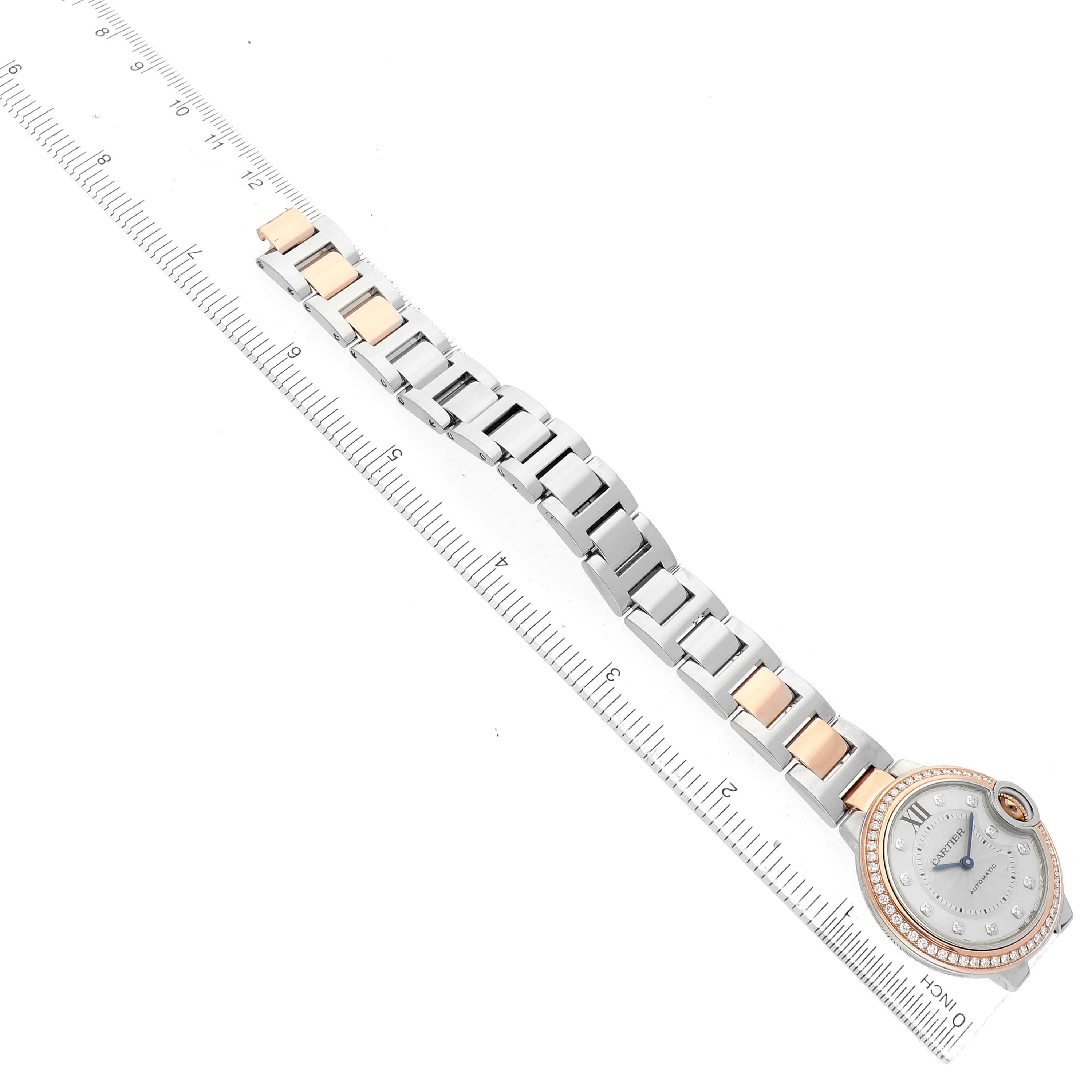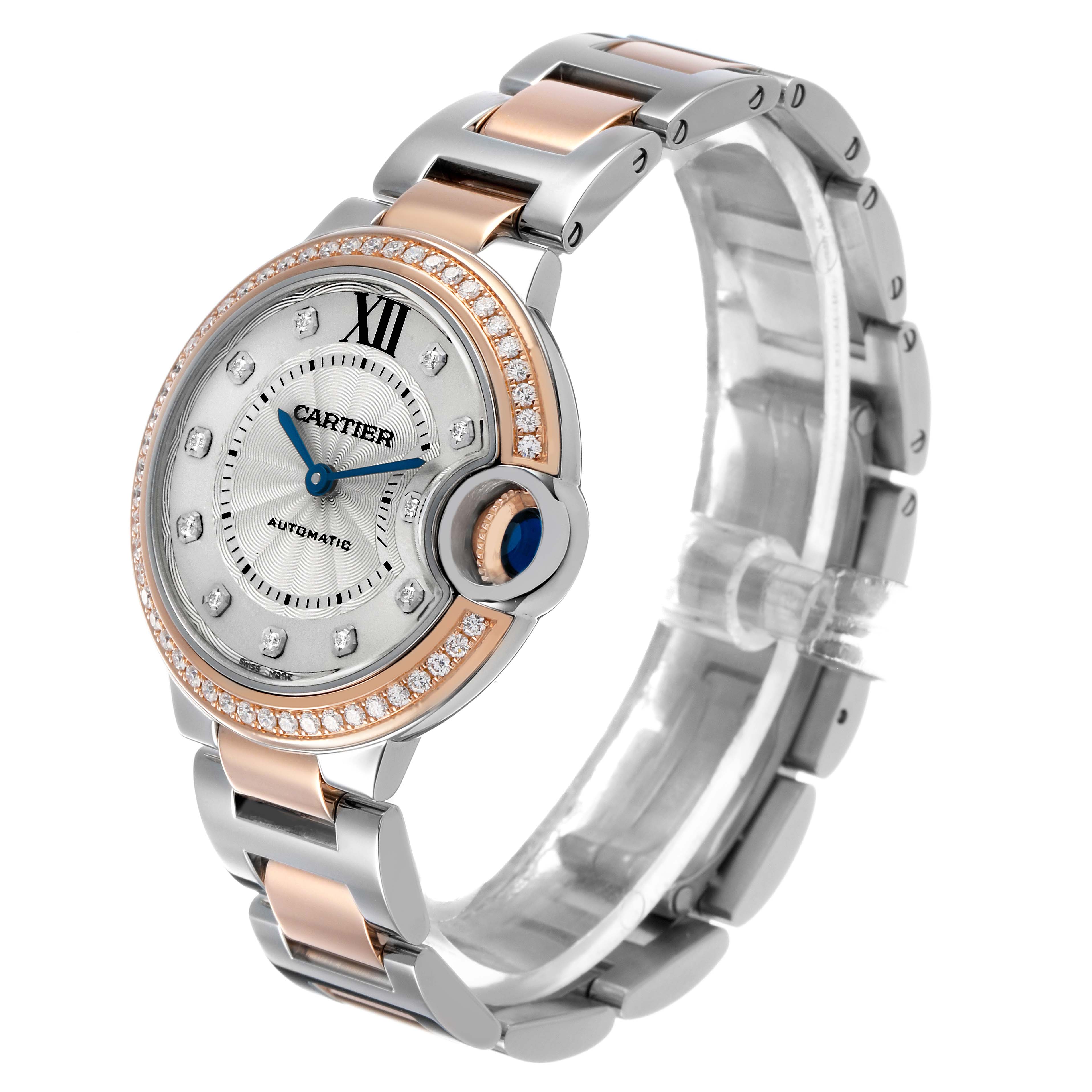 Cartier Ballon Bleu 33 Diamond Dial Steel Rose Gold Ladies Watch WE902077 Card. Automatic self-winding movement. Round stainless steel and 18k rose gold case 33.0 mm in diameter. Fluted crown set with the blue spinel cabochon. 18k rose gold original Cartier factory diamond bezel. Scratch resistant sapphire crystal. Silvered guilloche dial with original Cartier factory diamond hour markers and an inner minute track. Blue sword-shaped hands. Stainless steel and 18k rose gold bracelet with a hidden clasp. Fits a 6.5" wrist.