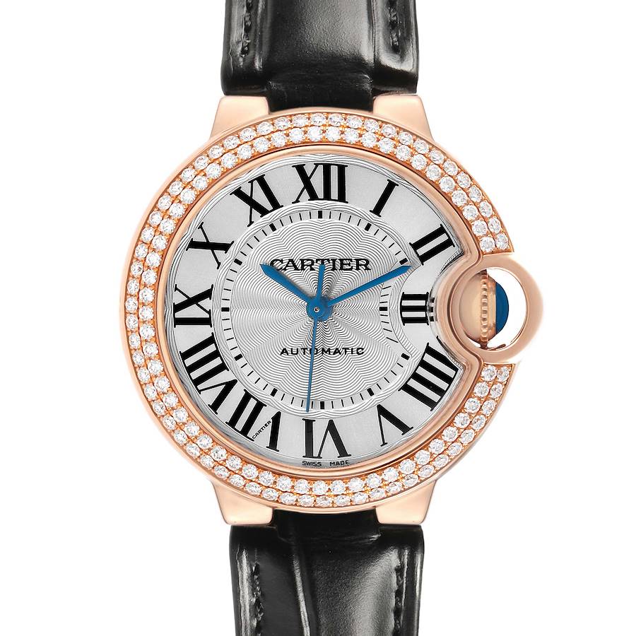 Cartier Ballon Bleu 33 Rose Gold Diamond Ladies Watch WE902066. Automatic self-winding movement. 18K rose gold round case 33.0 mm in diameter. Fluted 18k rose gold crown set with a blue sapphire cabochon. 18K rose gold original Cartier diamond set bezel. Domed scratch resistant sapphire crystal. Silver guilloche dial with black radial Roman numeral hour markers and an inner minute track. Blued steel sword-shaped hands. Black leather strap with an 18K rose gold tang buckle.