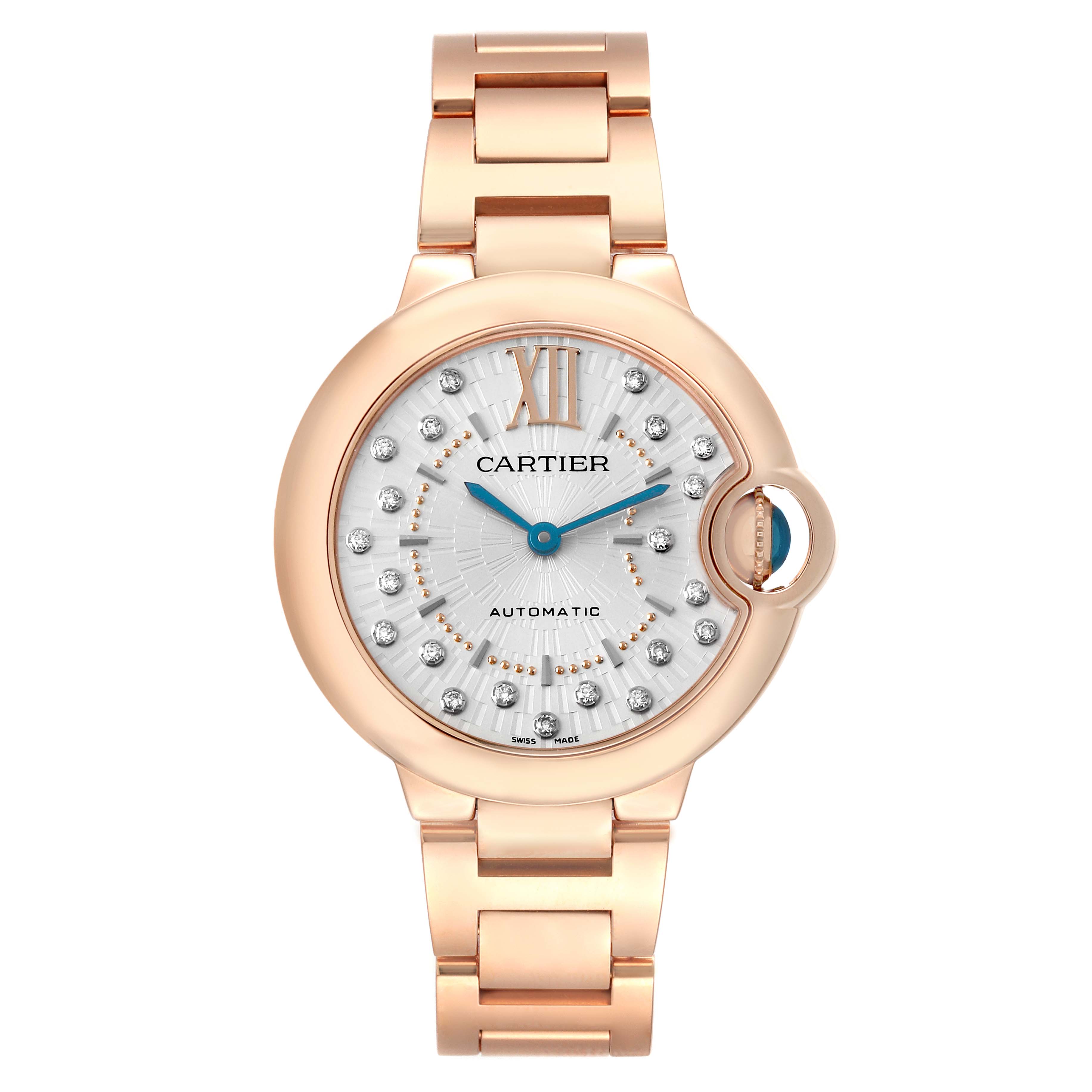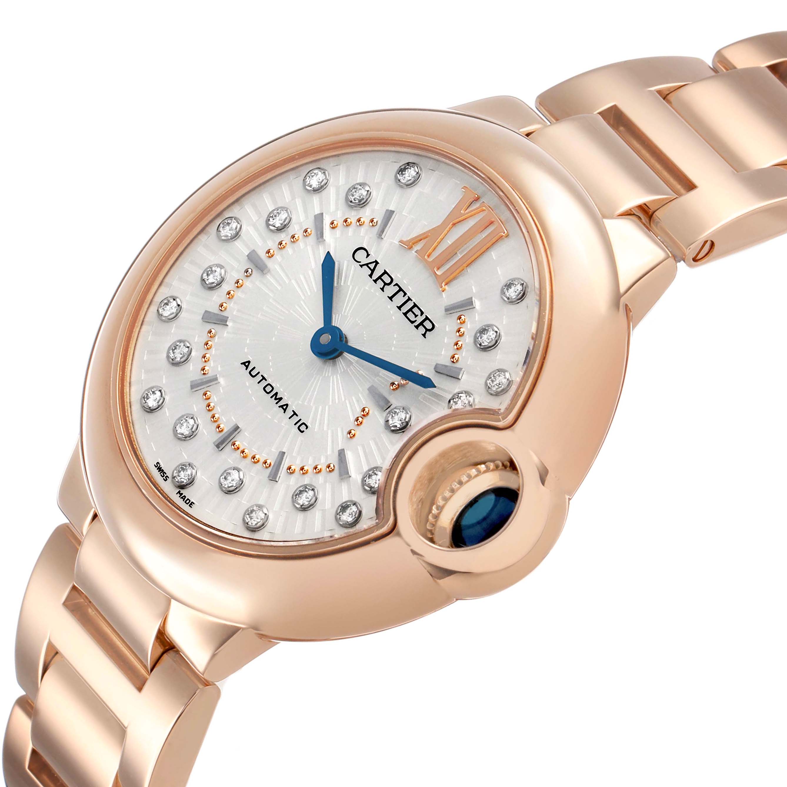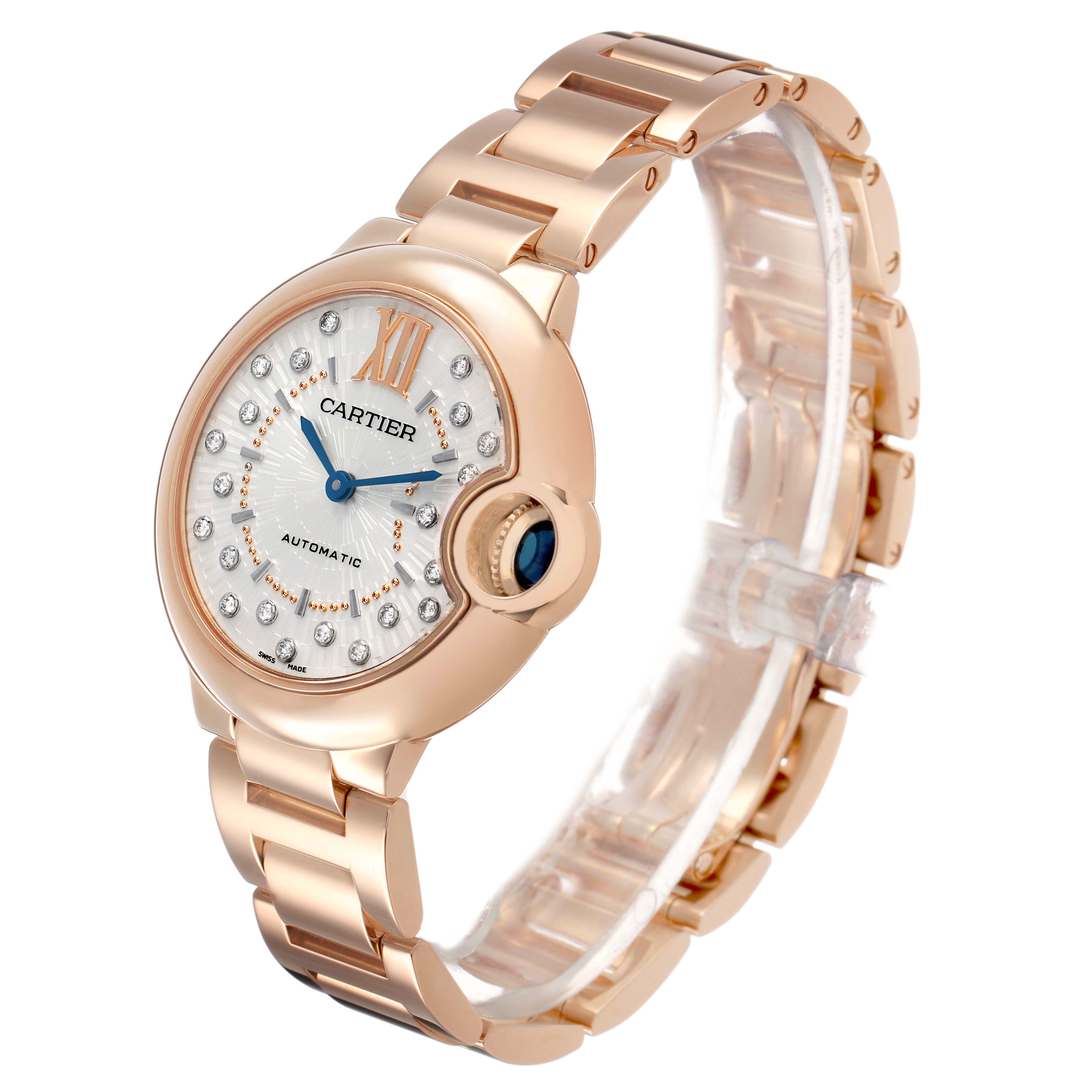 Cartier Ballon Bleu 33 Rose Gold Diamond Ladies Watch WGBB0054 Box Card. Automatic self-winding movement. 18k rose gold round case 33.0 mm in diameter. Fluted crown set with a blue cabochon sapphire. 18k rose gold smooth bezel. Scratch resistant sapphire crystal. Matt silvered stamped sunray dial with original Cartier factory diamond hour markers and an inner minute track. Blue sword-shaped hands. 18k rose gold bracelet with a double deployant clasp. Fits a 6 3/4'' wrist.