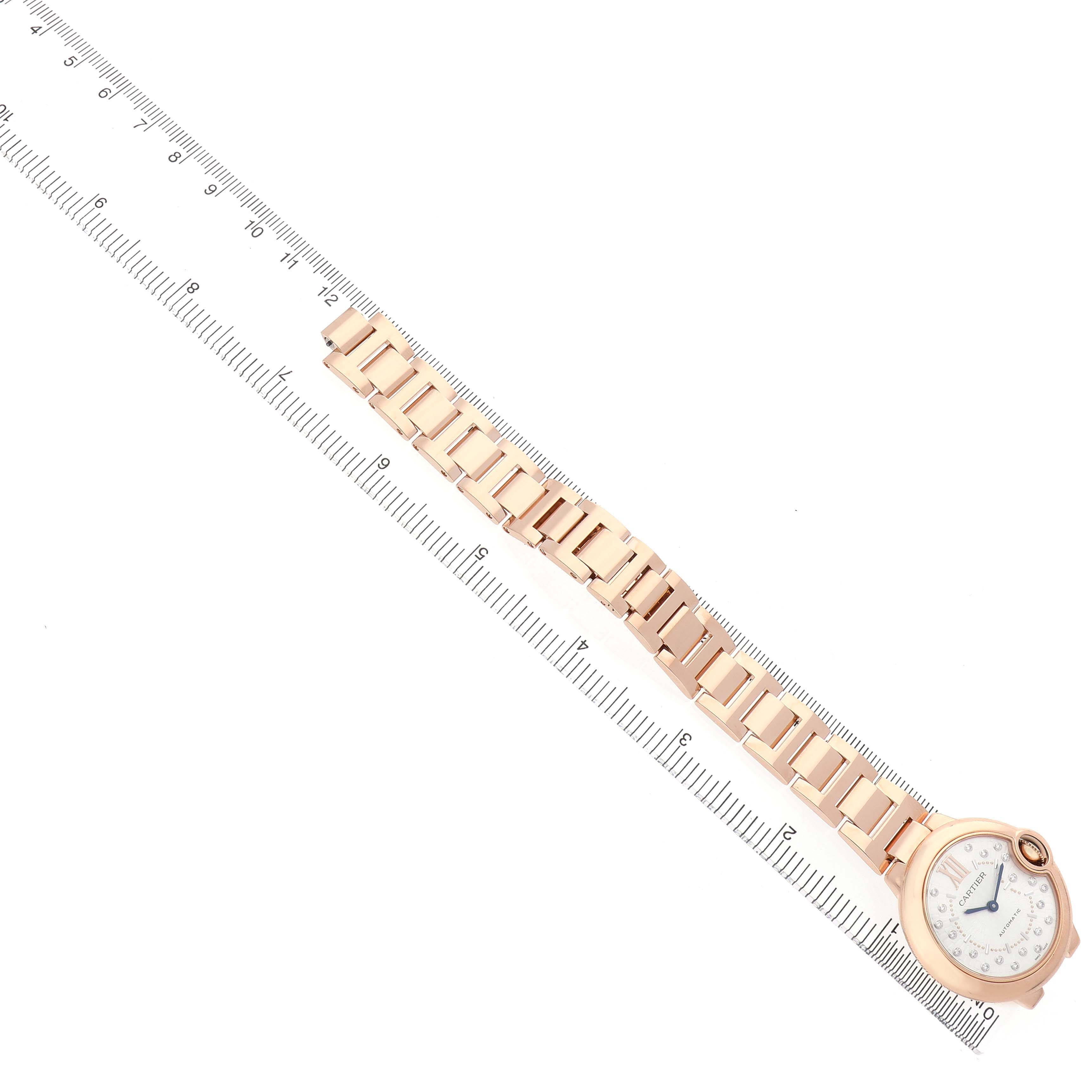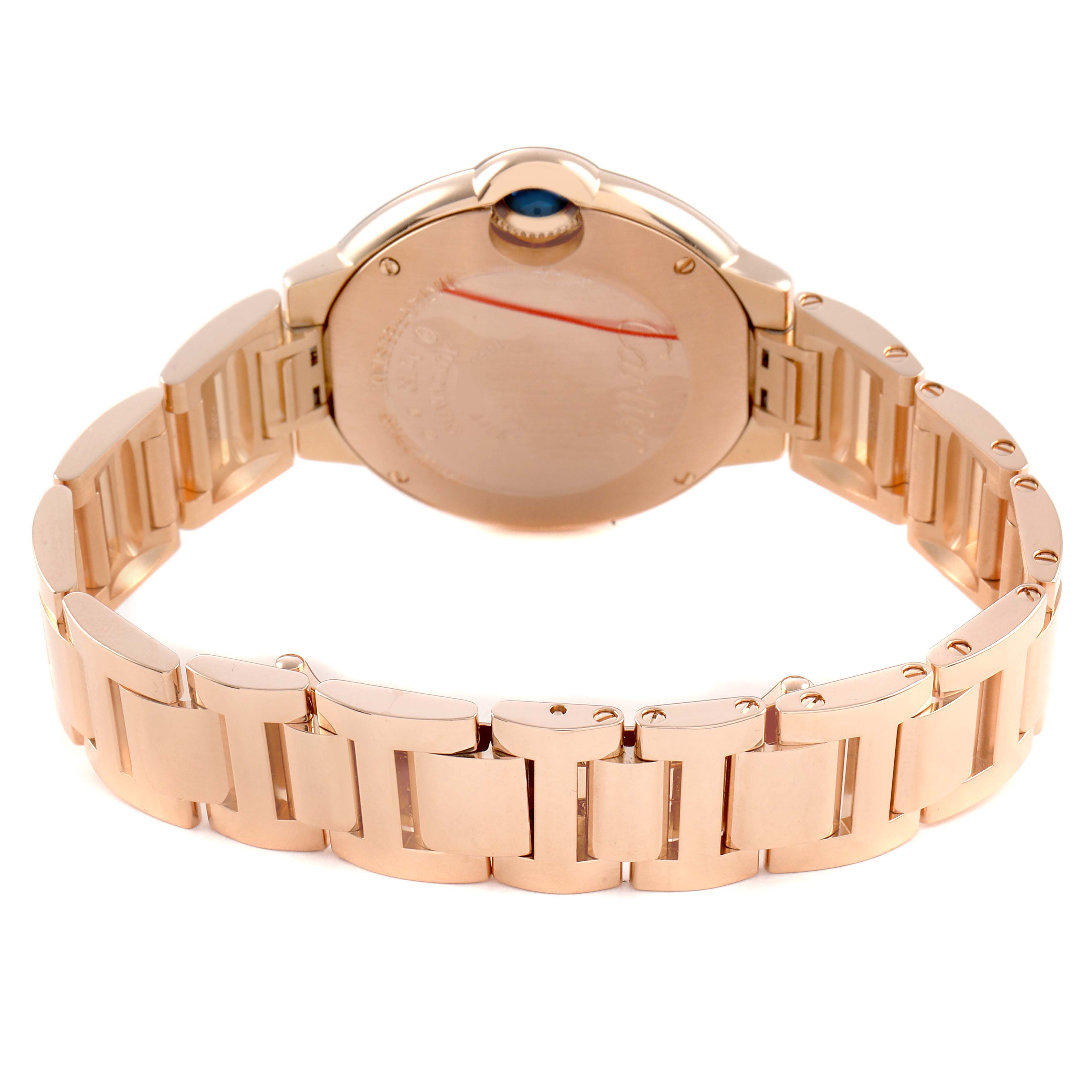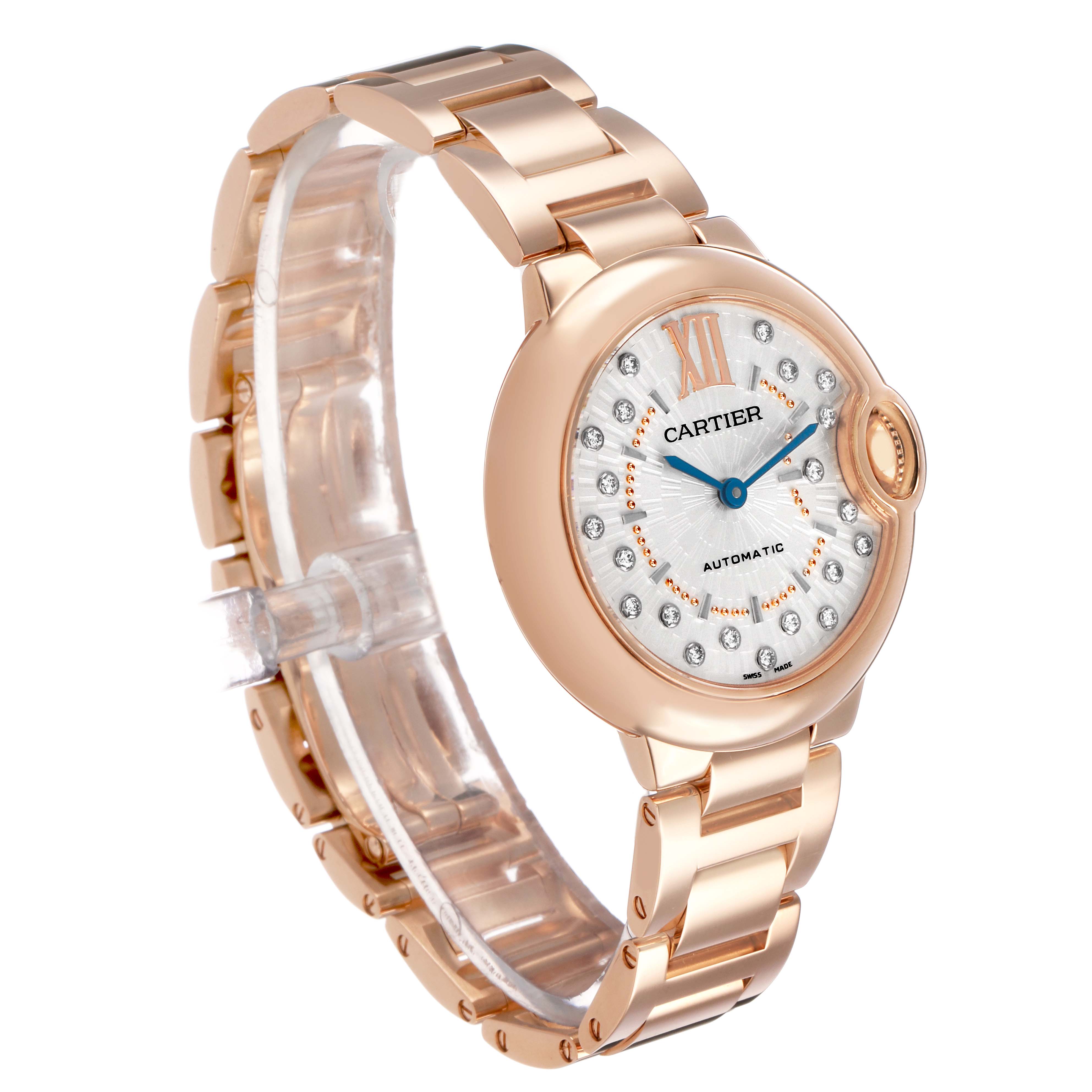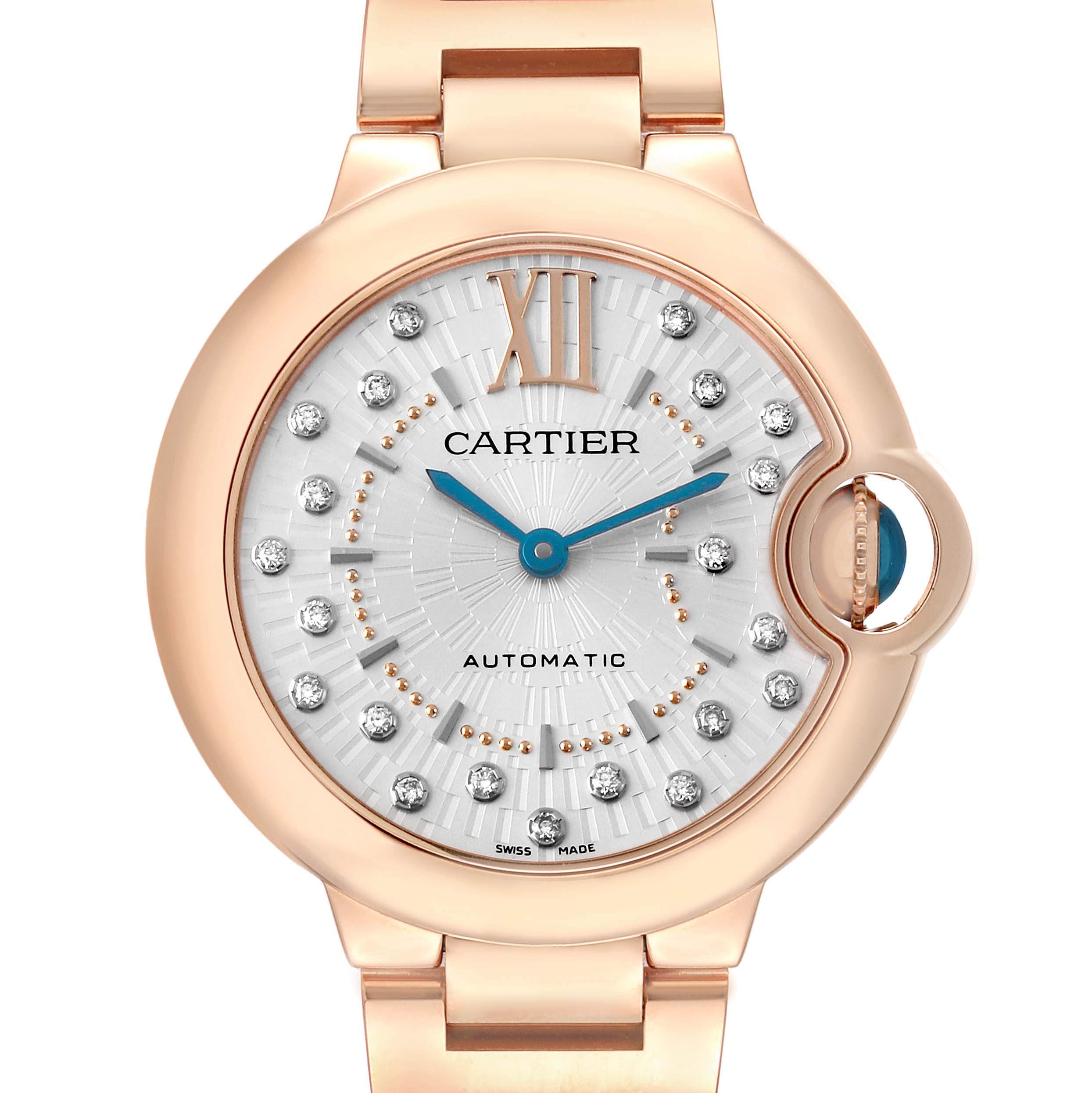 Cartier Ballon Bleu 33 Rose Gold Diamond Ladies Watch WGBB0054 Box Card. Automatic self-winding movement. 18k rose gold round case 33.0 mm in diameter. Fluted crown set with a blue cabochon sapphire. 18k rose gold smooth bezel. Scratch resistant sapphire crystal. Matt silvered stamped sunray dial with original Cartier factory diamond hour markers and an inner minute track. Blue sword-shaped hands. 18k rose gold bracelet with a double deployant clasp. Fits a 6 3/4'' wrist.