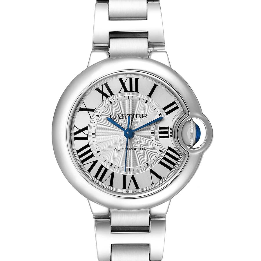 Cartier Ballon Bleu 33 Steel Ladies Watch W6920071 Card. Automatic self-winding movement. Caliber 076. Stainless steel round case 33.0 mm in diameter. Fluted crown set with the blue spinel cabochon. Stainless steel smooth bezel. Scratch resistant sapphire crystal. Silver guilloche dial wth black Roman numeral hour markers and an inner minute track. Blue sword-shaped hands. Secret Cartier signature at VII. Stainless steel bracelet with a hidden clasp. Fits a 6 1/4" wrist.