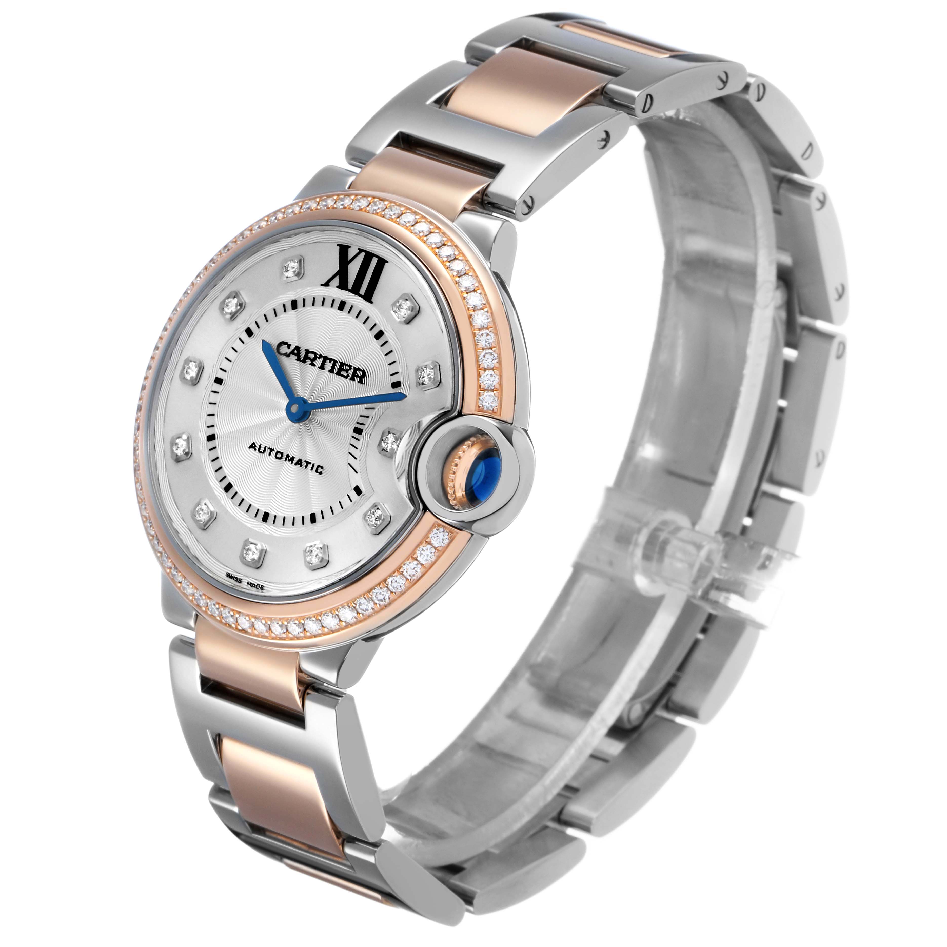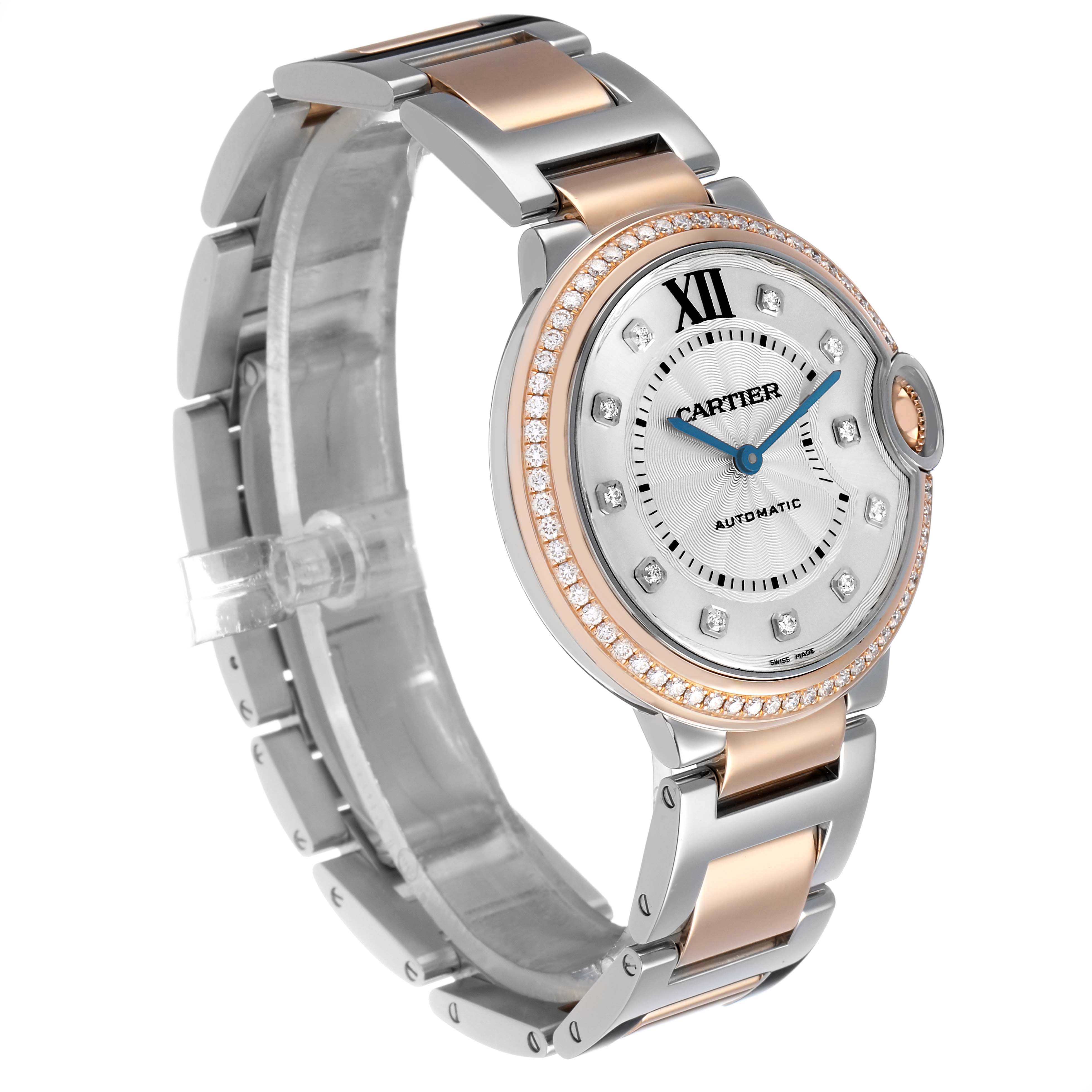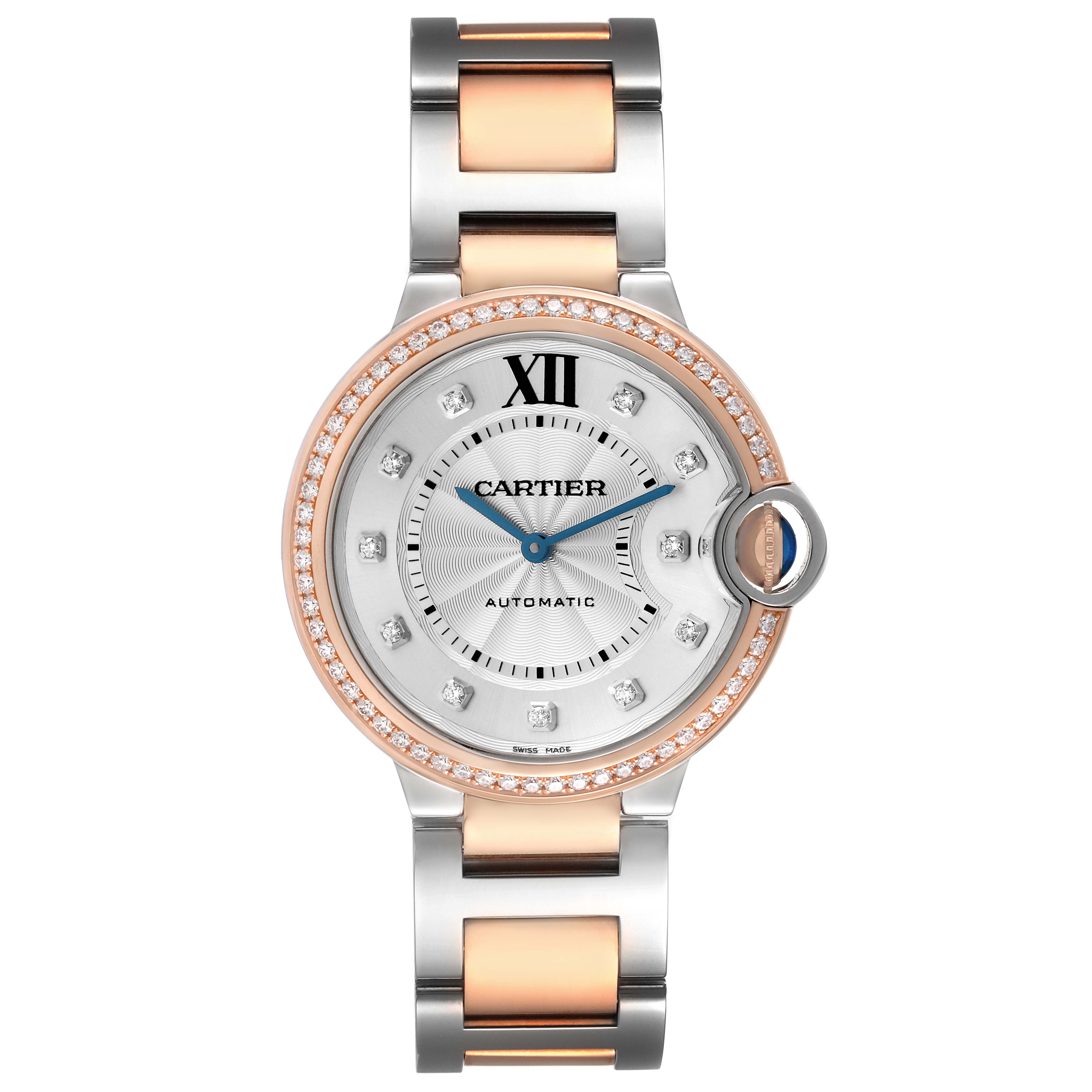 Cartier Ballon Bleu 36 Steel Rose Gold Diamond Dial Ladies Watch W3BB0004 Card. Automatic self-winding movement. Round stainless steel and 18k rose gold case 36.0 mm in diameter. Fluted 18k rose gold crown set with a blue spinel cabochon. 18k rose gold bezel set with original Cartier factory diamonds. Scratch resistant sapphire crystal. Silvered guilloche dial with original Cartier factory diamond hour markers. Black painted Roman numeral hour marker at 12. Blued steel sword-shaped hands and an inner minute track. Stainless steel and 18k rose gold bracelet with hidden double deployant clasp. Fits a 7 1/4" wrist.