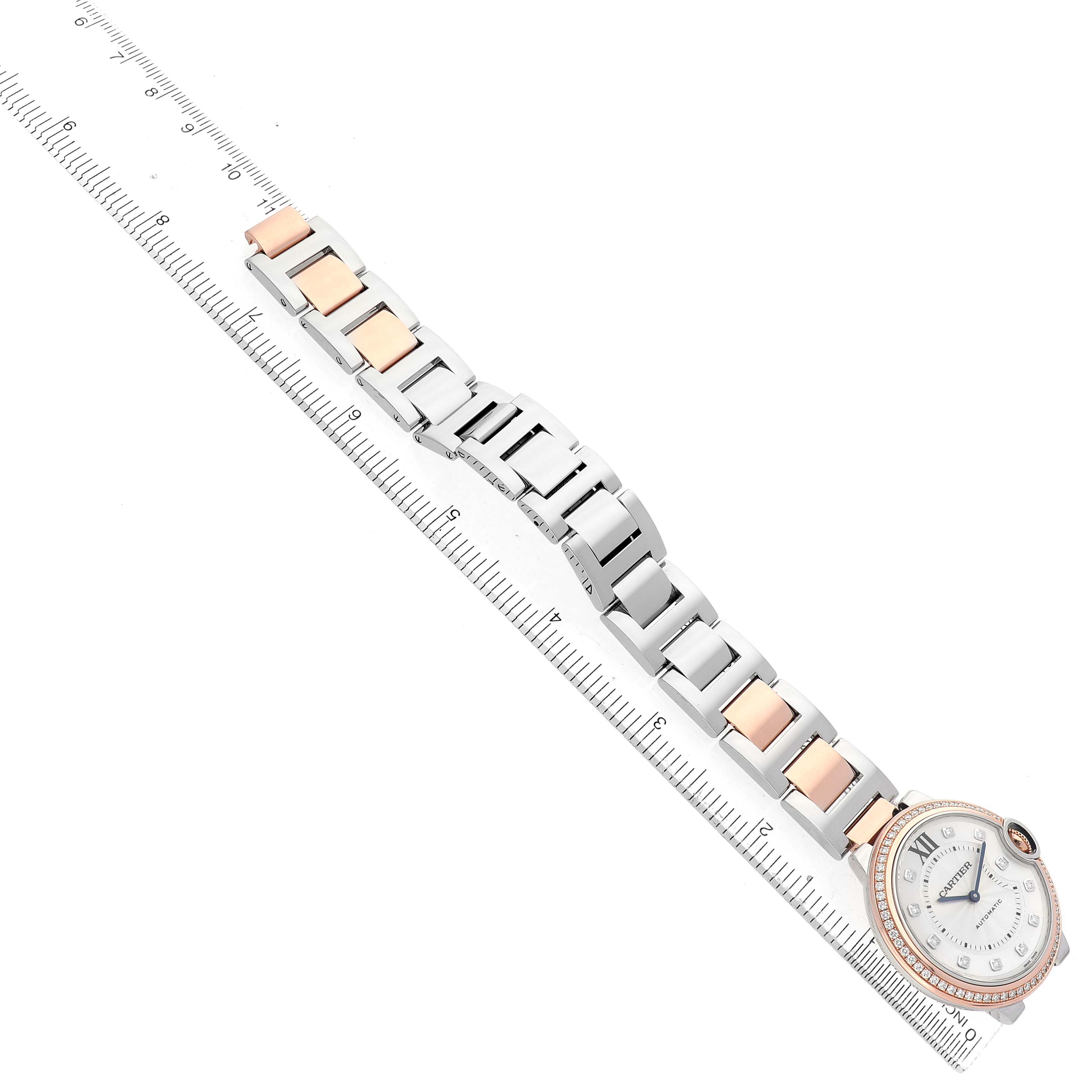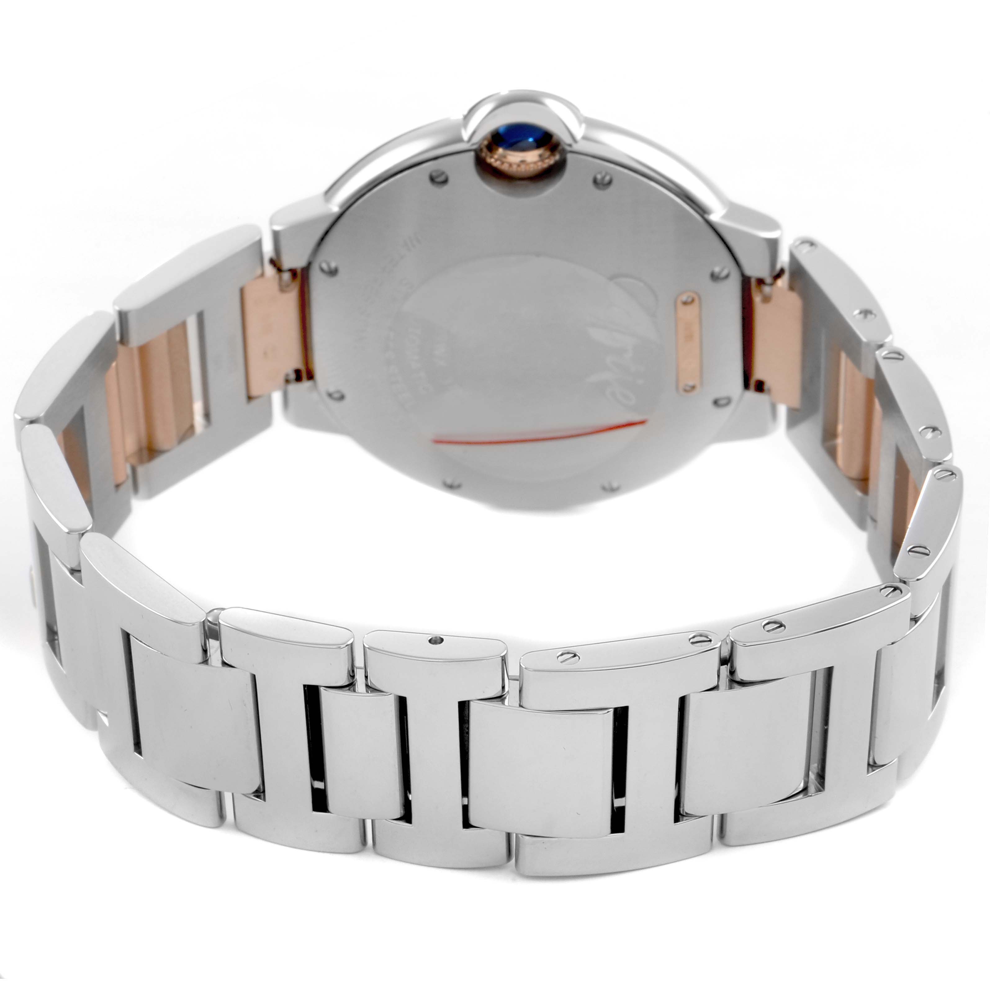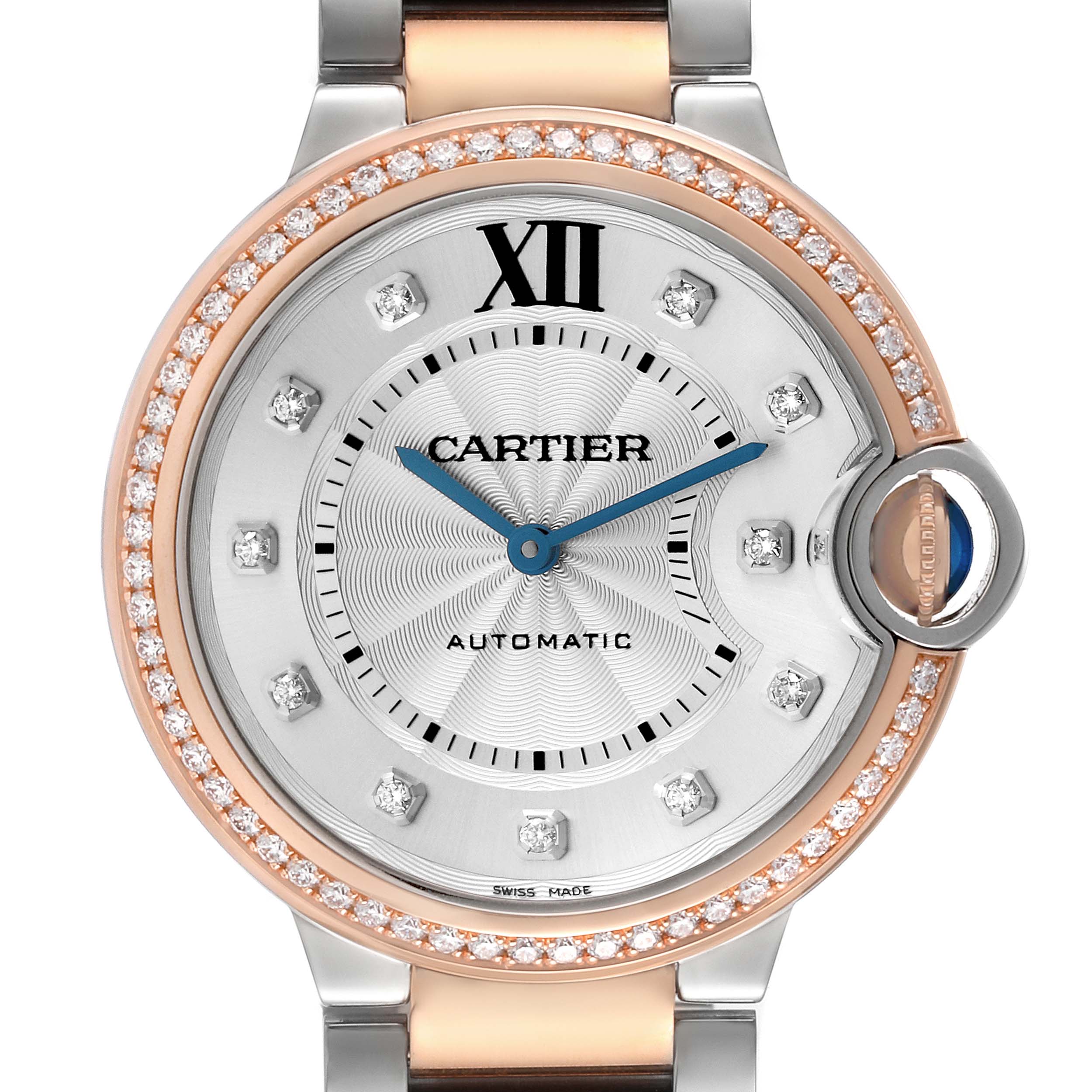 Cartier Ballon Bleu 36 Steel Rose Gold Diamond Dial Ladies Watch W3BB0004 Card. Automatic self-winding movement. Round stainless steel and 18k rose gold case 36.0 mm in diameter. Fluted 18k rose gold crown set with a blue spinel cabochon. 18k rose gold bezel set with original Cartier factory diamonds. Scratch resistant sapphire crystal. Silvered guilloche dial with original Cartier factory diamond hour markers. Black painted Roman numeral hour marker at 12. Blued steel sword-shaped hands and an inner minute track. Stainless steel and 18k rose gold bracelet with hidden double deployant clasp. Fits a 7 1/4" wrist.