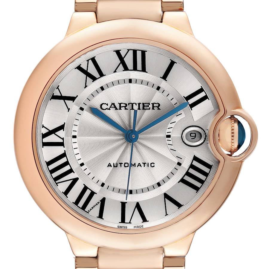 Cartier Ballon Bleu 42 Rose Gold Silver Dial Mens Watch WGBB0039. Automatic self-winding movement. 18K rose gold round case 42.0 mm in diameter, 13 mm thick. Fluted crown set with the blue spinel cabochon covered by a protective crown cap. Smooth stainless steel bezel. Domed scratch resistant sapphire crystal. Silver guilloche dial with black Roman numeral hour markers and blued steel sword-shaped hands. Date calendar at 3 o’clock. Inner minute track. Secret Cartier signature at VII. 18K rose gold bracelet with a double push-button double deployant clasp. Fits a 7" wrist.