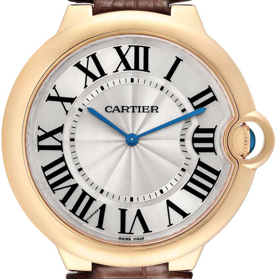Cartier Ballon Bleu 46 Yellow Gold Mens Watch W690054 Box Papers. Manual winding movement. 18K yellow gold case 46.0 mm in diameter, 7.00 mm thick. Fluted crown set with the blue sapphire cabochon. Smooth 18K yellow gold bezel. Scratch resistant sapphire crystal. Silver guilloche dial with painted roman numerals. Blue sword shape hands. Secret Cartier signature at VII. Brown leather strap with 18K yellow gold deployant buckle.