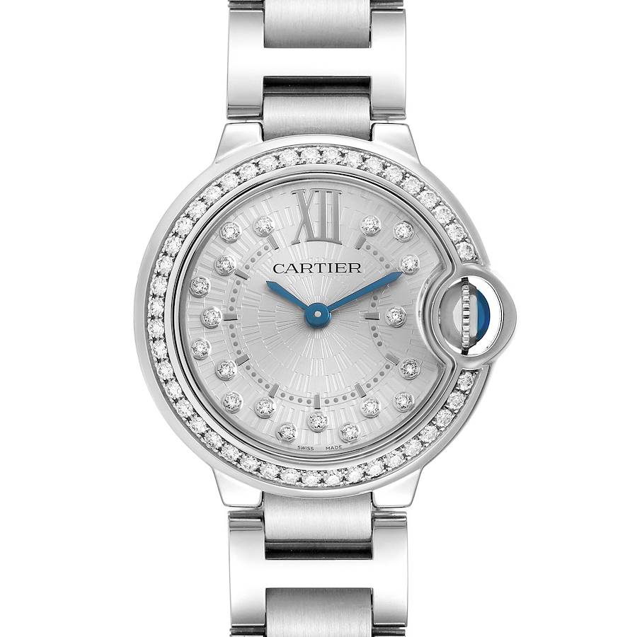 Cartier Ballon Bleu 28 Diamond Steel Quartz Ladies Watch W4BB0034 Box Card. Quartz movement. Stainless steel round case 28.0 mm in diameter. Fluted crown set with the blue spinel cabochon. Stainless steel bezel set with 42 original Cartier factory diamonds. Domed, scratch resistant sapphire crystal. Silver sunray-brushed dial with orginal Cartier factory diamond hour markers and blued steel sword-shaped hands. Black Roman numeral at XII. Minute markers around an inner ring. Stainless steel bracelet with a hidden double deployant clasp. Fits a 6 3/4" wrist.