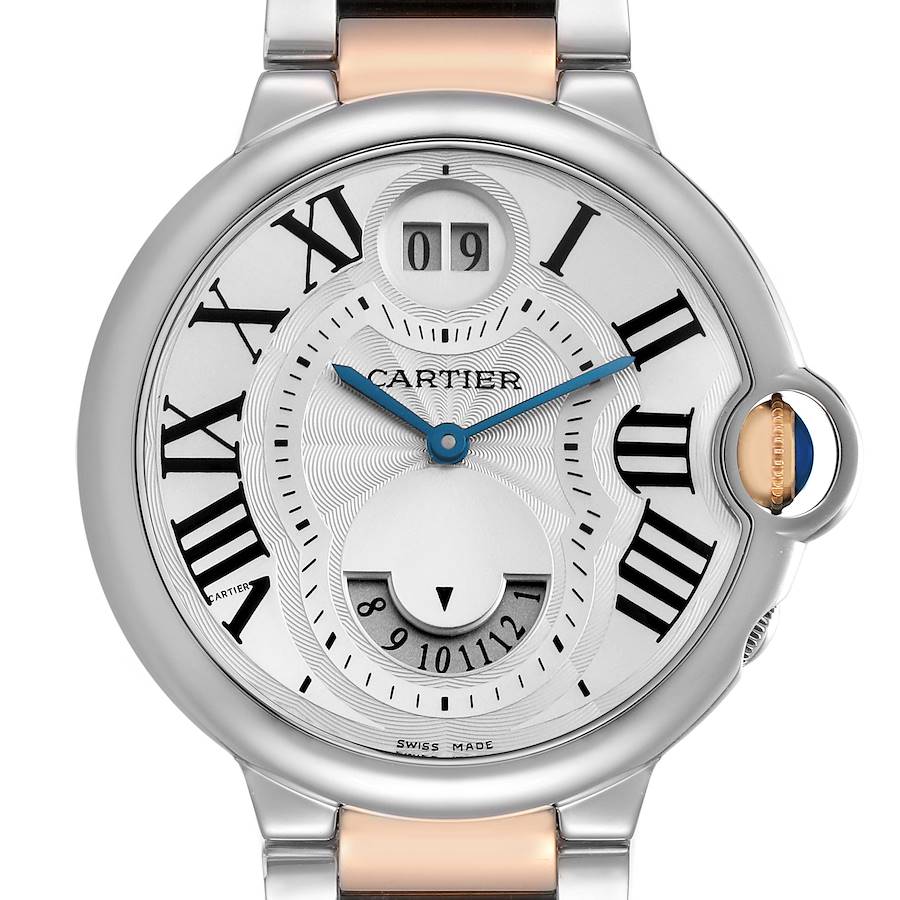 Cartier Ballon Bleu Steel Rose Gold Dual Time Zone Mens Watch W6920027. Quartz movement. Round stainless steel case 38mm in diameter. Fluted 18K rose gold crown set with the blue spinel cabochon. . Domed, scratch resistant sapphire crystal. Silver guilloche dial with black radial Roman numeral hour markers and blued-steel sword-shaped hands. Minute markers around an inner ring. Date display at the 12 o'clock position. Dual time zone sub-dial at the 6 o'clock position. Secret Cartier signature at VIII. Stainless steel and rose gold bracelet with double deployant clasp. Fits an 8.5" wrist.
