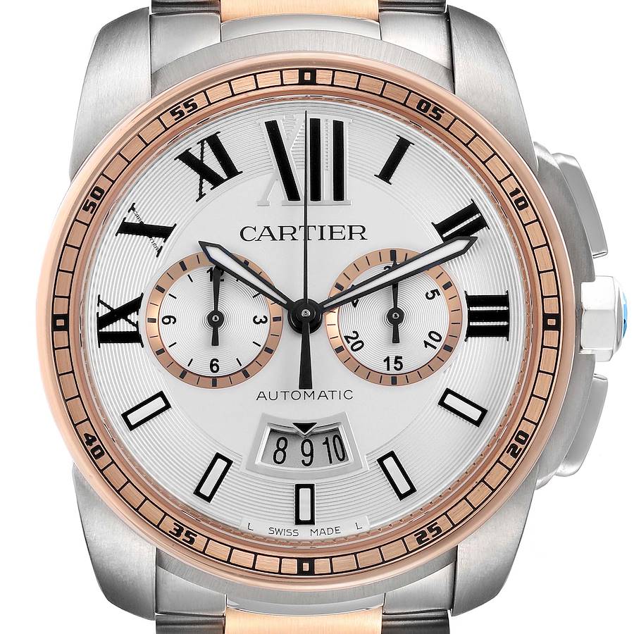 Cartier Calibre Chronograph Steel Rose Gold Mens Watch W7100042. Automatic self-winding chronograph movement. Caliber 1904-CH MC automatic mechanical chronograph movement, beating at 28,800 vph, containing 35 jewels and having a power reserve of 48 hours. Stainless steel round case 42.0 mm in diameter. Two pushers operate the chronograph functions. Crown set with the faceted blue sapphire. 18k rose gold fixed bezel with stick minute markers and Arabic numerals every fifth minute. Scratch resistant sapphire crystal. Silver dial with Roman numerals and baton hour markers. Luminescent oxidized sword-shaped hands. Date calendar at the 6 o'clock aperture. Two rose gold-outlined silver chronograph subdials for the 30-minute and 12-hour registers. Secret Cartier signature at X. Stainless steel and 18k rose gold bracelet with push button folding clasp. Fits a 7 3/4" wrist.