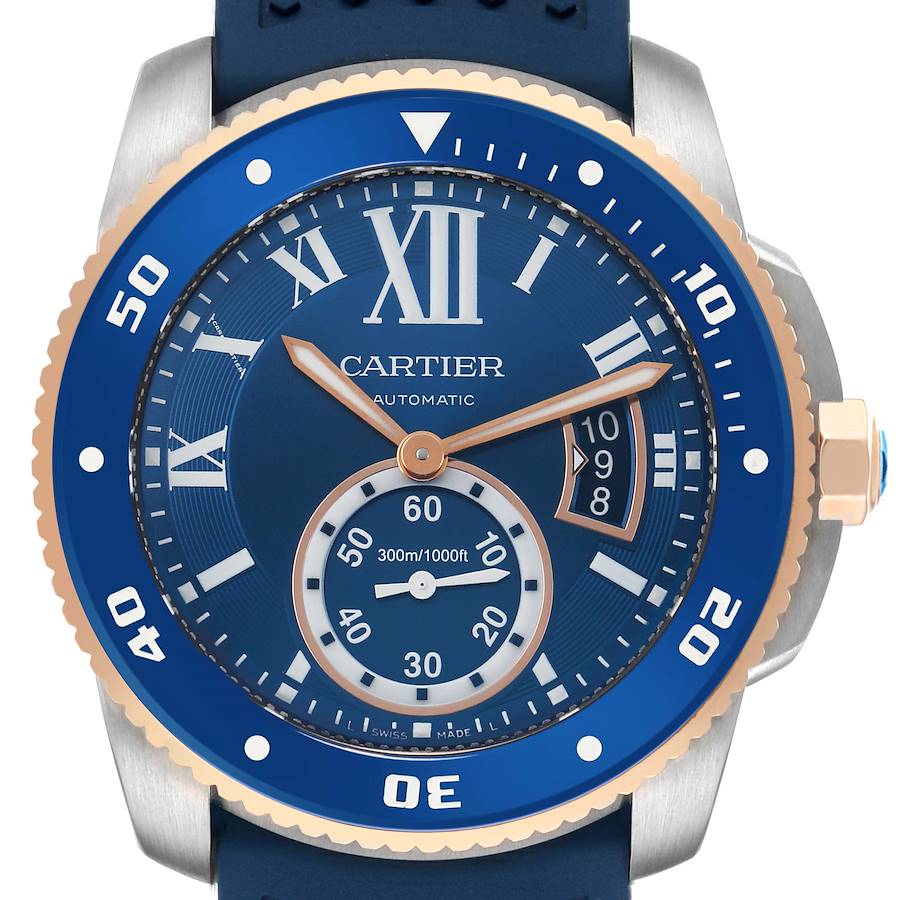 Cartier Calibre Diver Steel Rose Gold Blue Dial Mens Watch W2CA0009. Automatic self-winding movement with a 48-hour power reserve. Stainless steel round case 42.0 mm in diameter. 18K rose gold crown set with faceted blue spinel. Crown guards. Blue ceramic unidirectional rotating bezel with Super-LumiNova indicators and 18K rose gold ring. Domed, scratch resistant sapphire crystal. Partly snailed blue dial with white Roman numeral hour markers and luminescent-inlayed 18k rose gold sword-shaped hands. Date aperture at 3 o'clock. Small running seconds subdial at 6 o'clock. Outer stick minute markers. Blue rubber strap with stainless steel tang buckle.