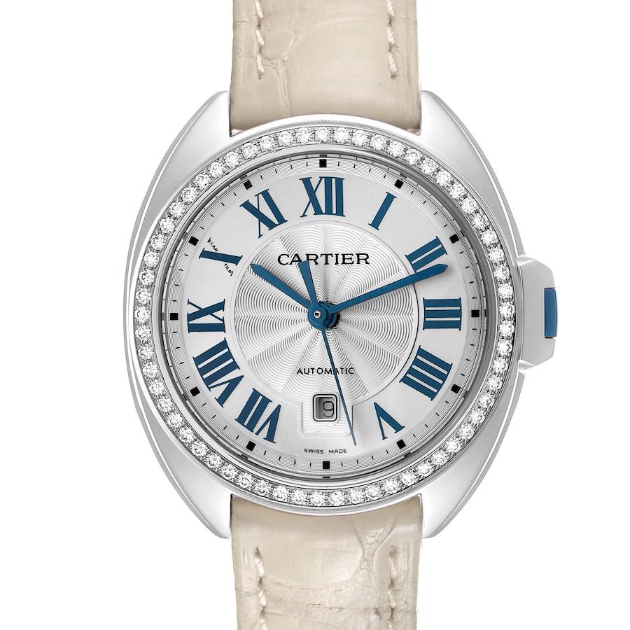 Cartier Cle Steel Diamond Beige Strap Ladies Watch W4CL0005 Papers. Automatic self-winding movement. Round stainless steel case 31 mm in diameter. Flush-mounted crown set with a blue spinel cabochon. Stainless steel bezel set with original Cartier factory diamonds. Scratch resistant sapphire crystal. Silver dial with a sunray guilloche pattern center and blue Roman numeral hour markers. Blued-steel sword shape hands. Minute markers around an inner ring. Date window at 6 o'clock. Secret Cartier signature at X. Beige leather strap with stainless steel deployant buckle.