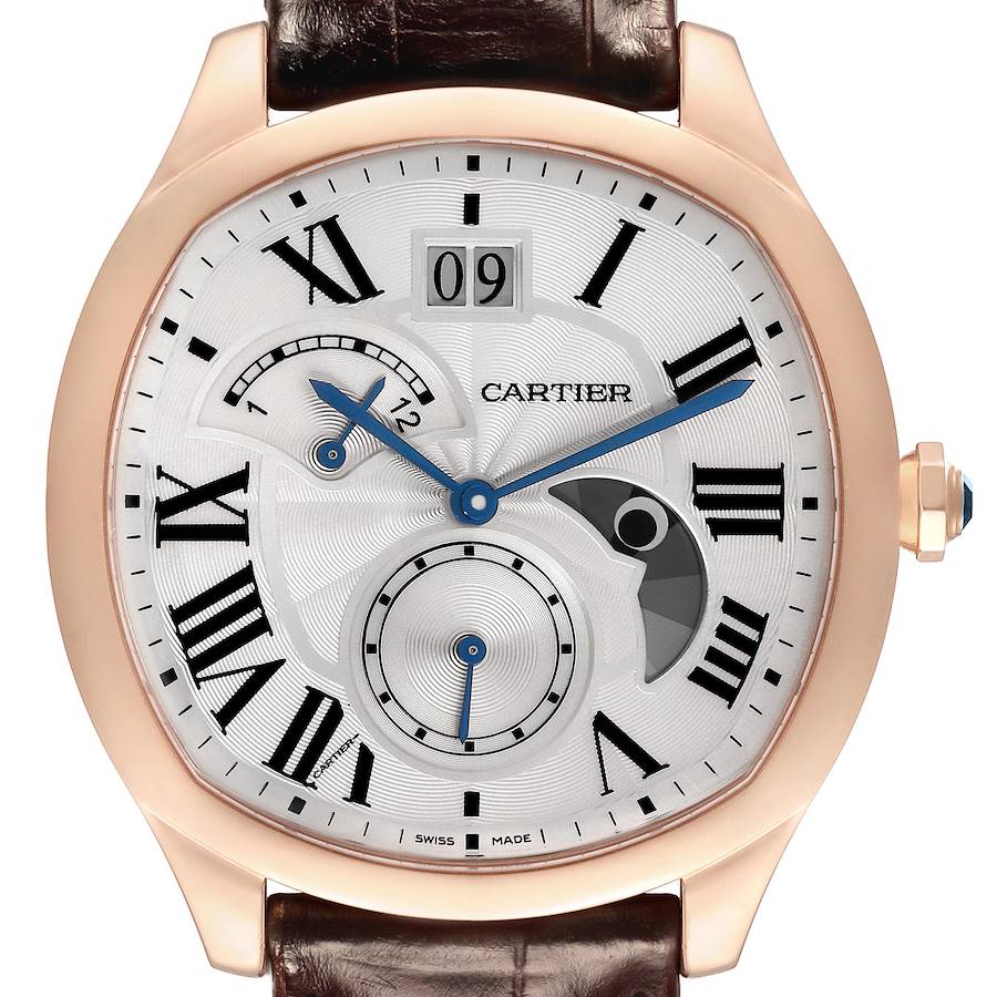Cartier Drive Retrograde Rose Gold Chronograph Mens Watch WGNM0005. Automatic self-winding movement. Second time zone and day night indicator. Cushion-shaped 18K rose gold case 47.12 mm x 41.20 mm. 18k rose gold crown cover with faceted blue sapphire. Transparent exhibition sapphire crystal caseback. 18K rose gold smooth bezel. Scratch resistant sapphire crystal. Silver guilloche dial with blued steel sword-shaped hands and painted black Roman numeral hour markers. Small seconds subdial located at the 6 o'clock position. Large date double-window display at the 12 o'clock position. Retrograde GMT/Dual Time-Zone subdial located at the 10 o'clock position. Day and Night (am/pm) disc indicator via aperture between the 3 and 4 o'clock position. Secret Cartier signature at VII. Brown leather strap with 18K rose gold deployant buckle.