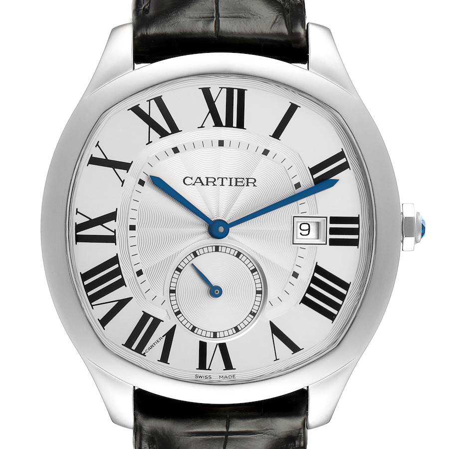 Cartier Drive Steel Silver Dial Mens Watch WSNM0004. Automatic self-winding movement. Stainless steel cushion-shaped case 40.0 mm in diameter. Octagonal crown cover set with faceted blue spinel. Transparent exhibition sapphire crystal caseback. Stainless steel smooth bezel. Domed, scratch resistant sapphire crystal. Silver guilloche dial with painted black radial Roman numeral hour markers and an inner minute track. Blued-steel sword shaped hands. Date calendar at the 3 o'clock aperture. Small seconds subdial at 6 o'clock. Secret Cartier signature at VII. Black leather strap with a stainless steel deployant clasp.