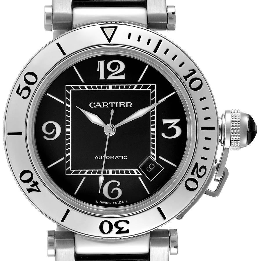 Cartier Pasha Seatimer Black Dial Steel Automatic Mens Watch W31080M7. Automatic self-winding movement. Stainless steel round case 40.5 mm in diameter. Crown cover set with a blue faceted spinel. Unidirectional rotating time-lapse bezel engraved with Arabic numeral 60-minute graduations. Scratch resistant sapphire crystal. Black dial with black stick hour markers and luminescent diamond-shaped rhodium-plated hands. Black painted Arabic numerals at 3, 6, 9, and 12 o'clock. Inner minute track. Date calendar window between 4 and 5 o'clock. Stainless steel bracelet with a push-button double deployant clasp. Fits an 7.5" wrist.