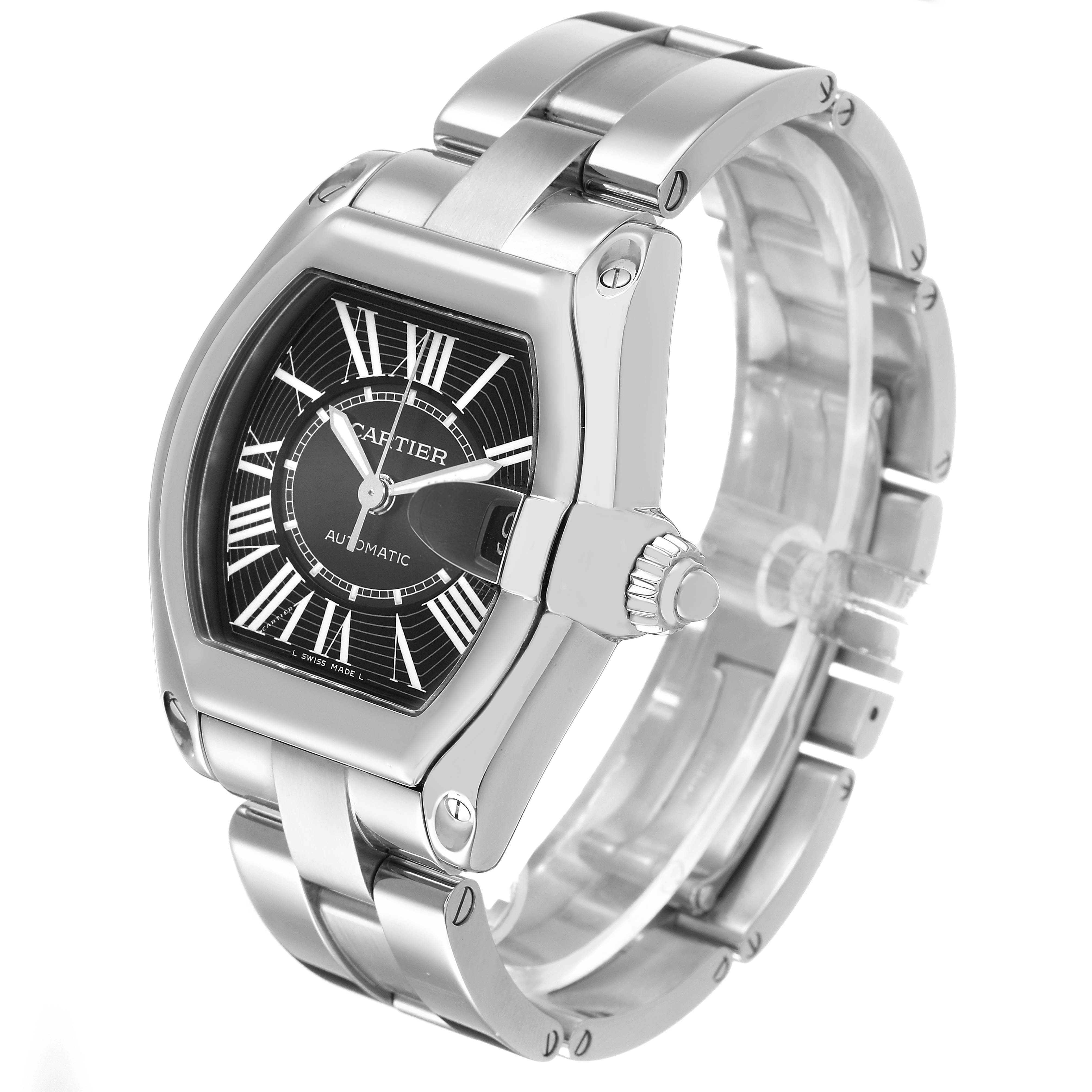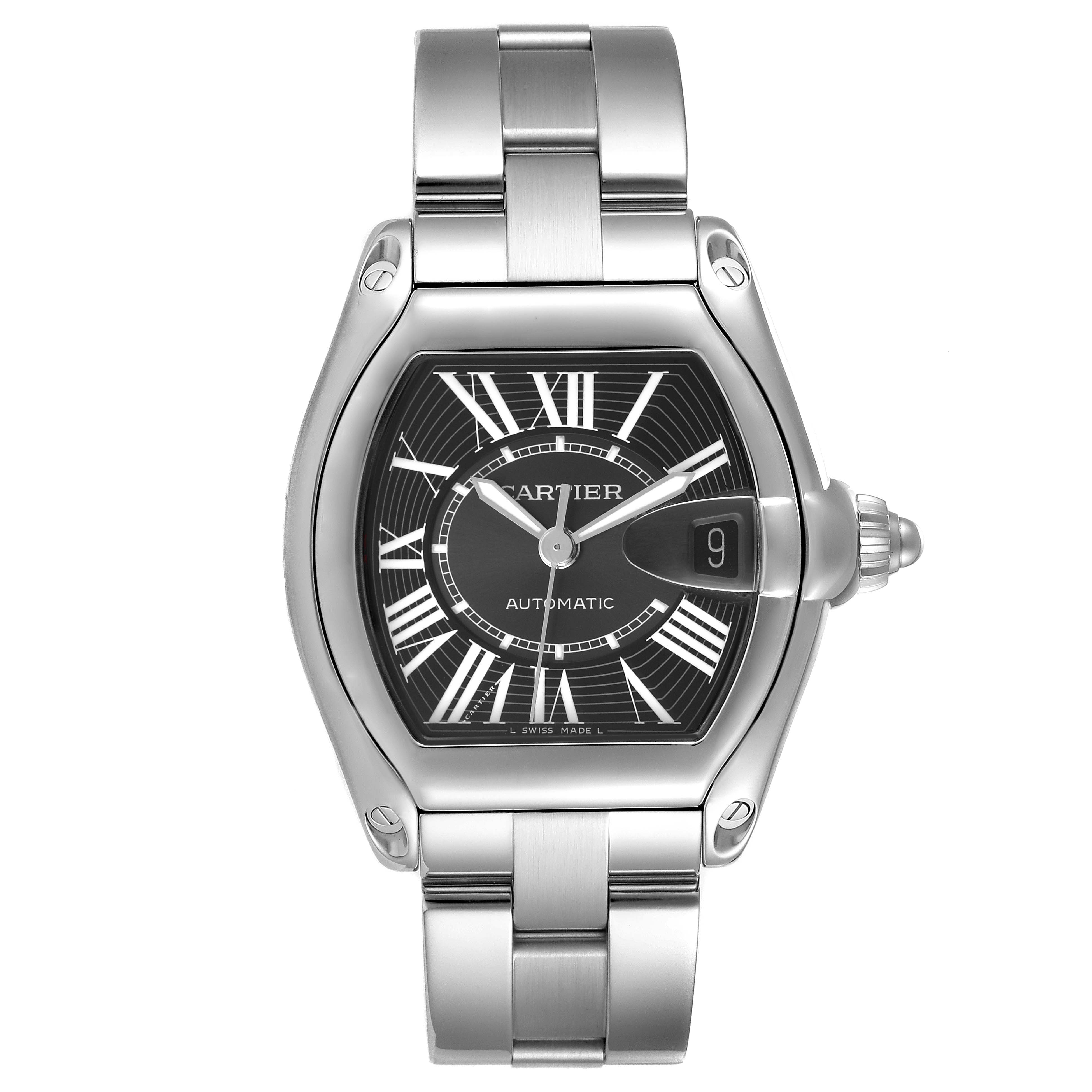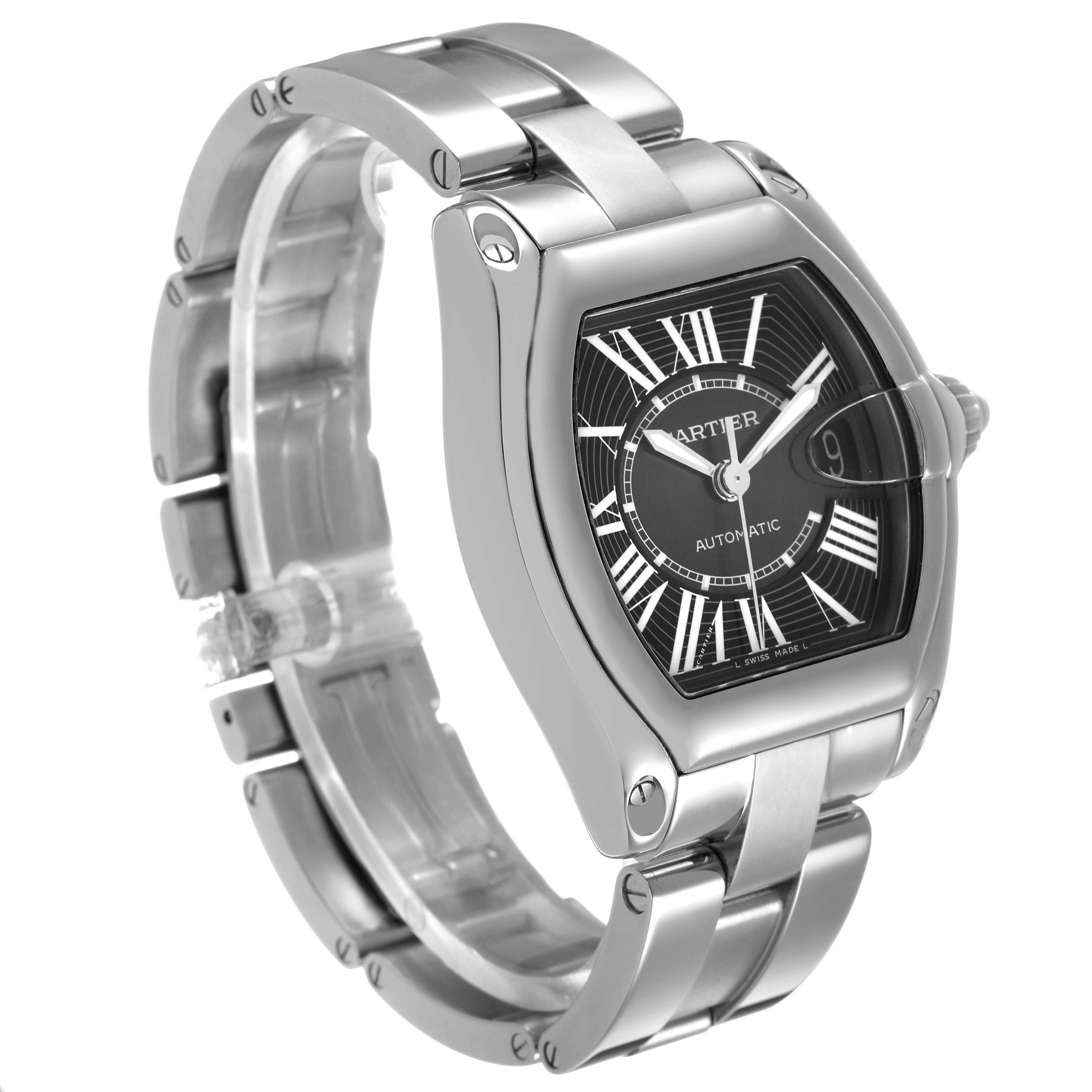 Cartier Roadster Large Black Dial Steel Automatic Mens Watch W62041V3 Box Papers. Automatic self-winding movement. Stainless steel tonneau shaped case 38.0 x 43.0 mm. Screw-down radiator cap style crown. Stainless steel bezel. Scratch resistant sapphire crystal with a cyclops magnifying glass. Black sunray effect dial with radial white Roman numeral hour markers and an inner minute track. Luminescent sword-shaped hands. Date window at 3 o'clock. Secret Cartier signature at VII. Stainless steel bracelet with a hidden double deployant clasp. Fits an 6 3/4" wrist.