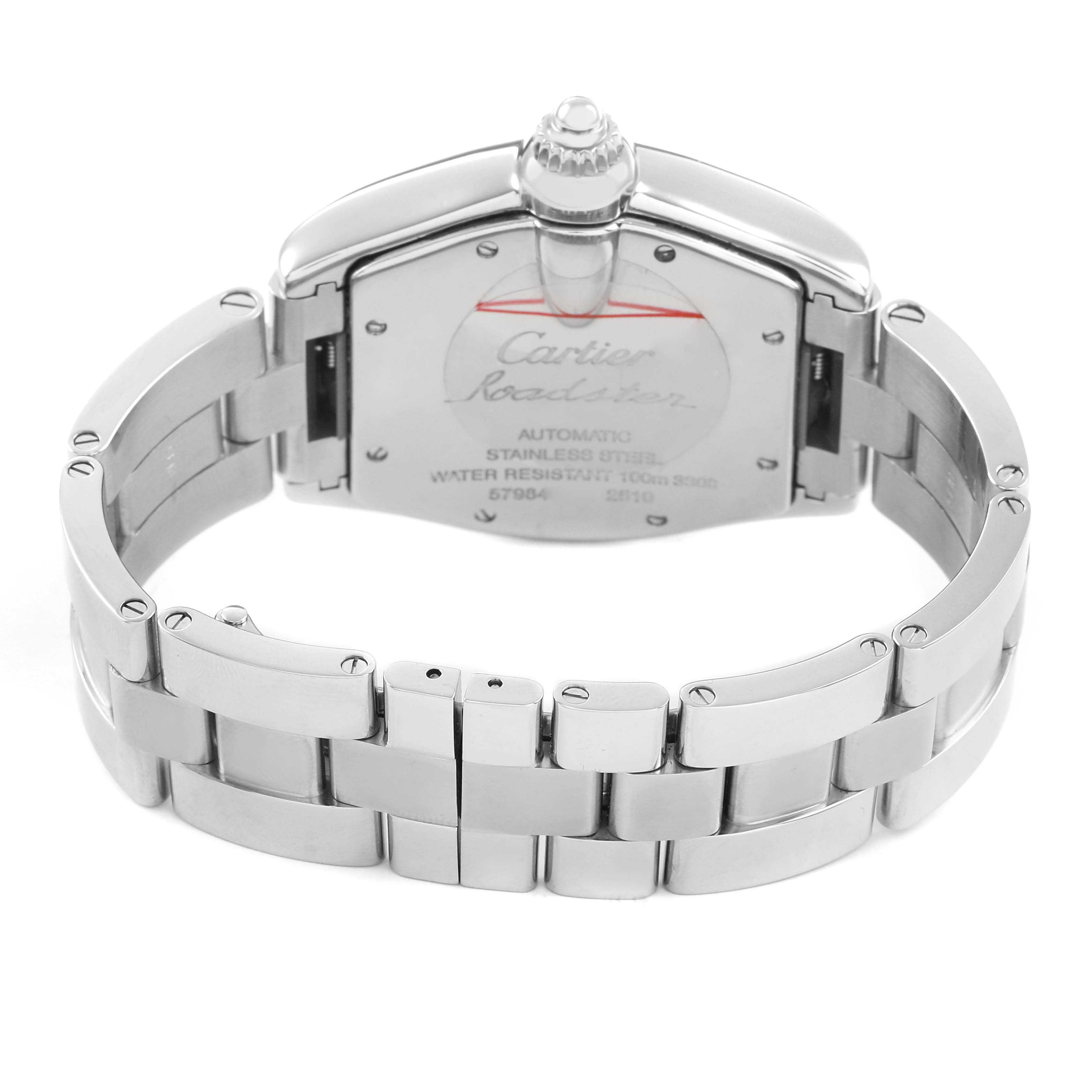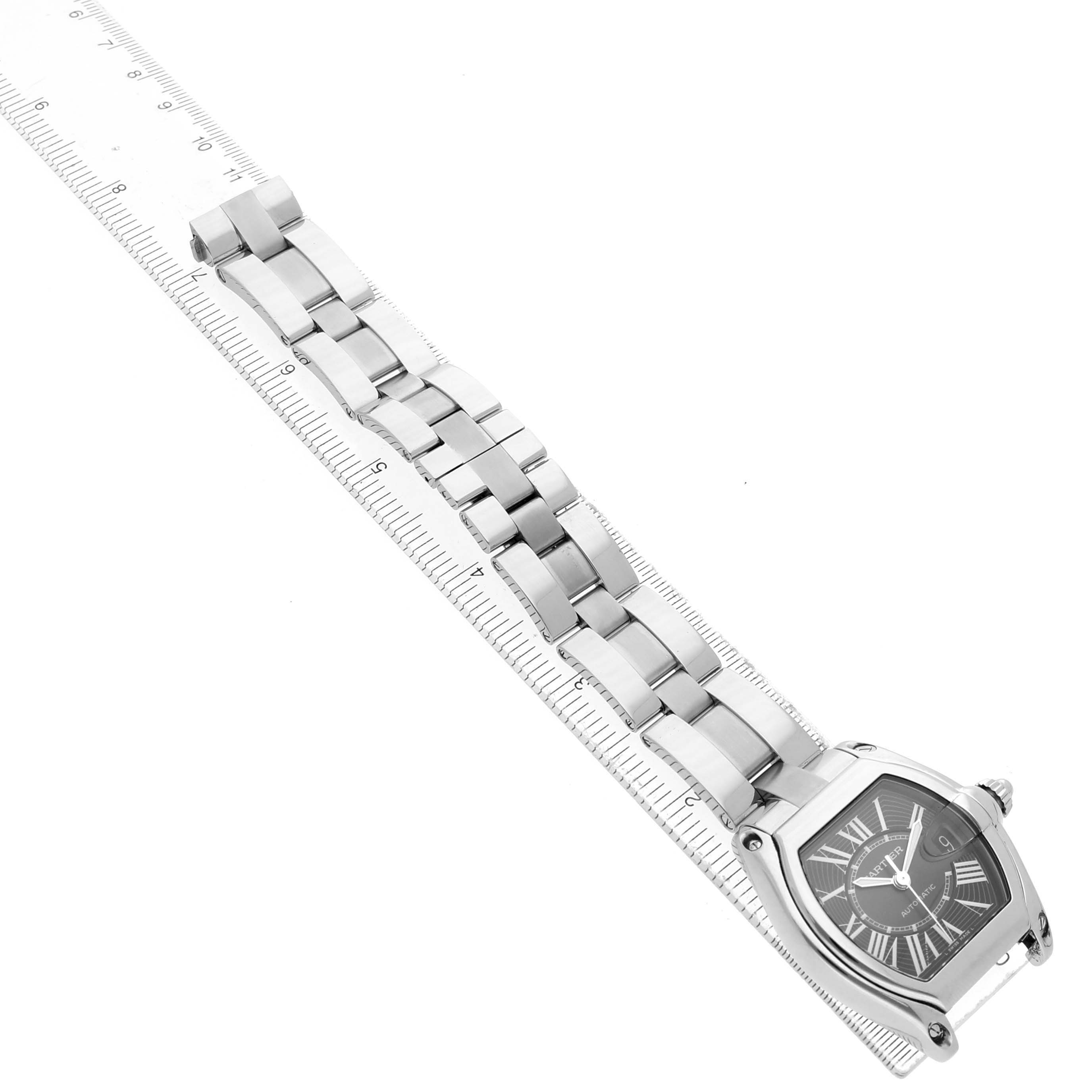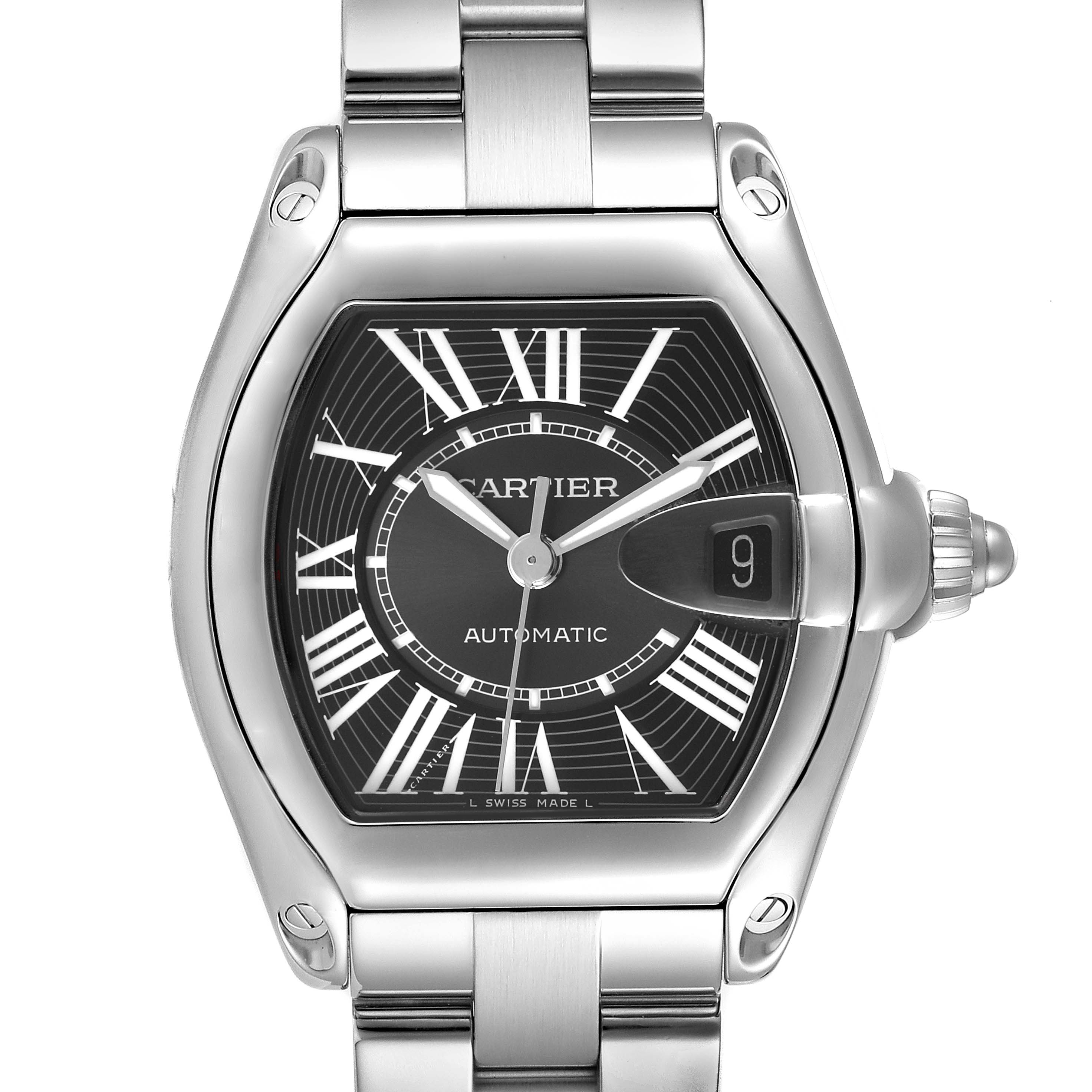 Cartier Roadster Large Black Dial Steel Automatic Mens Watch W62041V3 Box Papers. Automatic self-winding movement. Stainless steel tonneau shaped case 38.0 x 43.0 mm. Screw-down radiator cap style crown. Stainless steel bezel. Scratch resistant sapphire crystal with a cyclops magnifying glass. Black sunray effect dial with radial white Roman numeral hour markers and an inner minute track. Luminescent sword-shaped hands. Date window at 3 o'clock. Secret Cartier signature at VII. Stainless steel bracelet with a hidden double deployant clasp. Fits an 6 3/4" wrist.