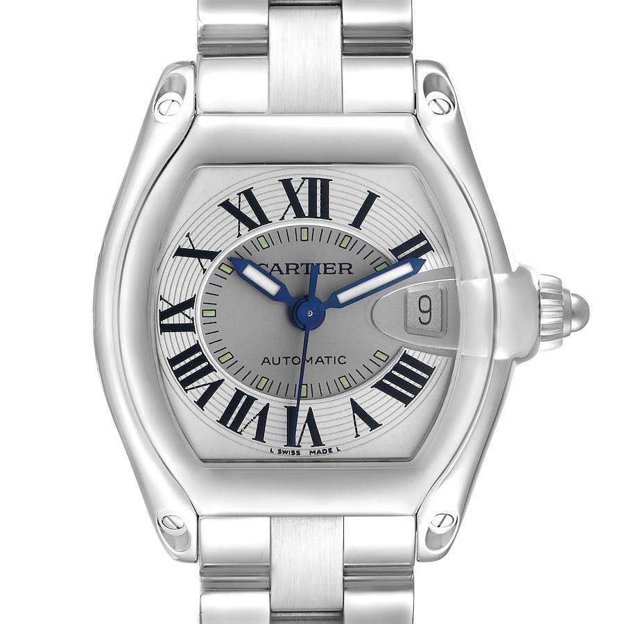 Cartier Roadster Large Steel Silver Dial Mens Watch W62025V3. Automatic self-winding movement. Stainless steel tonneau-shaped case 38.0 mm x 43.0 mm. Screw-down radiator cap style crown. . Scratch resistant sapphire crystal with a cyclops magnifying glass. Silver guilloche dial with black radial Roman numeral hour markers and an inner minute track. Luminescent sword-shaped oxidized hands. Date calendar at the 3 o'clock aperture. Secret Cartier signature on VII. Stainless steel bracelet with a hidden double deployant clasp. Fits an 7" wrist.