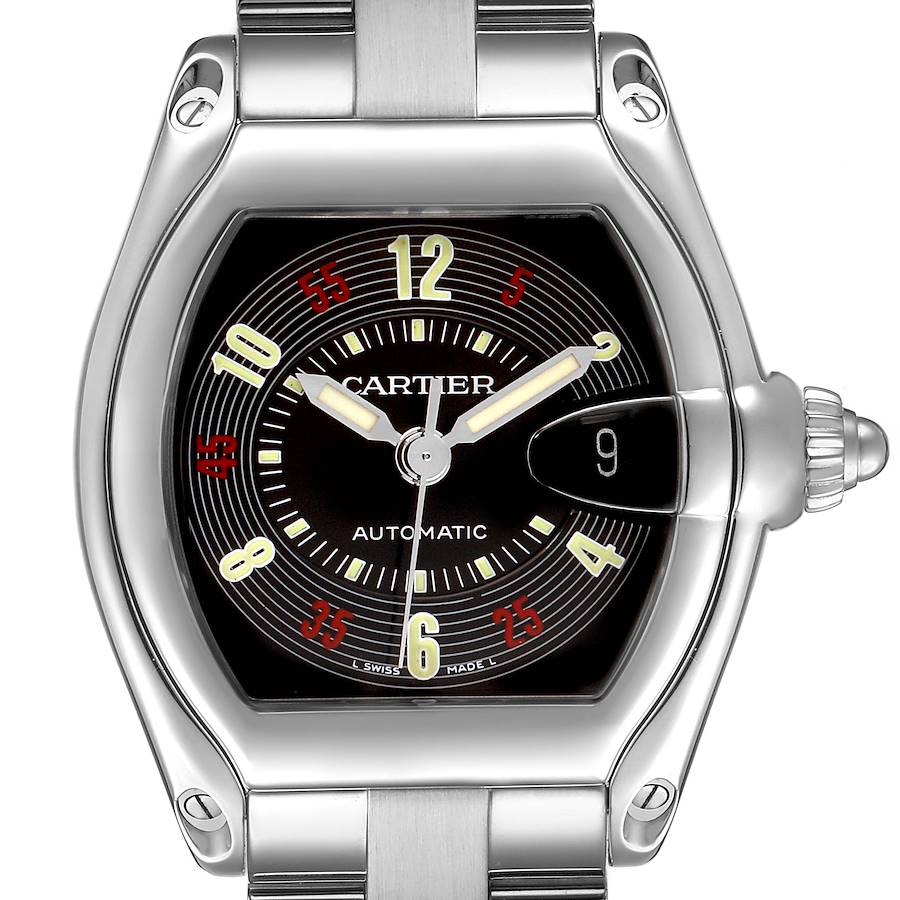 Cartier Roadster Vegas Roulette Red Green Steel Mens Watch W62002V3 Box Papers. Automatic self-winding movement. Stainless steel tonneau-shaped case 38.0 x 43.0 mm. . Scratch resistant sapphire crystal with a cyclops magnifier. Black Las Vegas Roulette dial with red and light green Arabic numeral hour markers. An inner minute track. Luminescent sword-shaped hands. Date calendar at the 3 o'clock aperture. Stainless steel bracelet with a hidden clasp. Fits a 7" wrist.