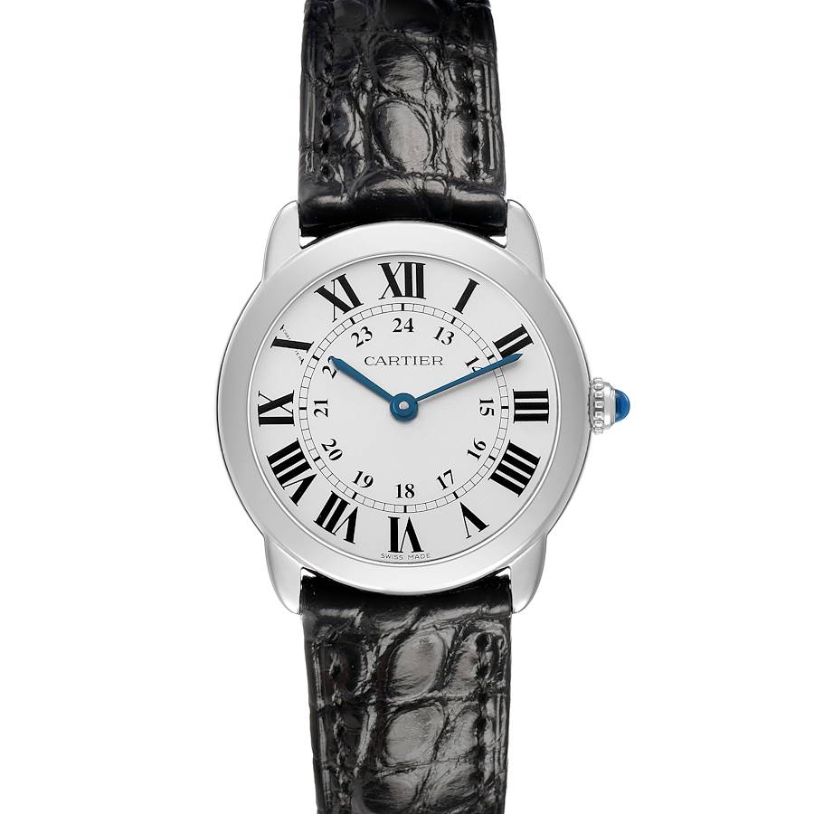 Cartier Ronde Solo 29 Steel Silver Dial Ladies Watch W6700155. Quartz movement. Stainless steel round case 29.0 mm in diameter. Circular grained crown set with the blue spinel cabochon. . Scratch resistant sapphire crystal. Silver grained dial with black Roman numeral hour markers and an inner minute track with inner Arabic numeral hour markers. Blued steel sword-shaped hands. Secret Cartier signature at X. Black leather strap with a stainless steel deployant clasp.