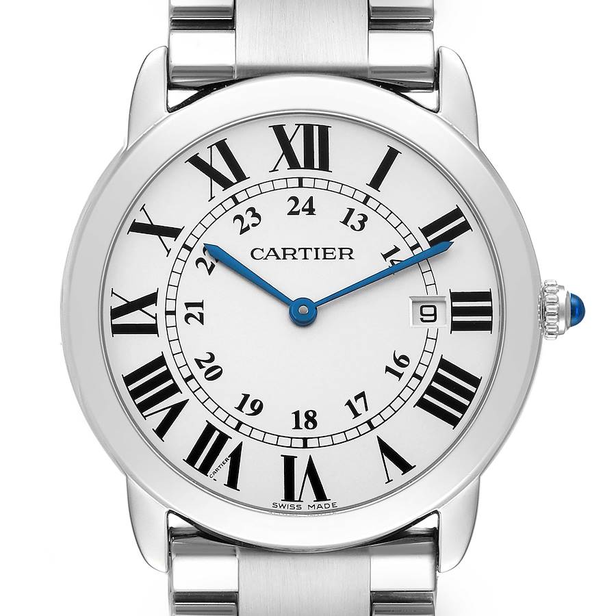 Cartier Ronde Solo 36 Large Steel Silver Dial Mens Watch W6701005. Quartz movement. Stainless steel round case 36.0 mm in diameter. Circular grained crown set with a blue spinel cabochon. . Scratch resistant sapphire crystal. Silvered opaline dial with black Roman numeral hour markers and an inner minute track. Internal Arabic numeral GMT accents. Blue sword-shaped hands. Secret Cartier signature at VII. Date calendar at the 3 o'clock aperture. Stainless steel bracelet with a hidden clasp. Fits a 7 1/2" wrist.