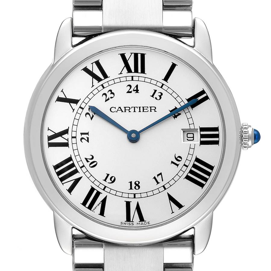 Cartier Ronde Solo Large Steel Silver Roman Dial Mens Watch W6700255. Quartz movement. Stainless steel round case 36.0 mm in diameter. Circular grained crown set with the blue spinel cabochon. . Scratch resistant sapphire crystal. Silver opaline dial with painted black Roman numeral hour markers and an inner minute track with Arabic numeral accents. Blued-steel sword-shaped hands. Secret Cartier signature at VII. stainless steel bracelet with hidden deployant clasp. Fits a 6 3/4" wrist.
