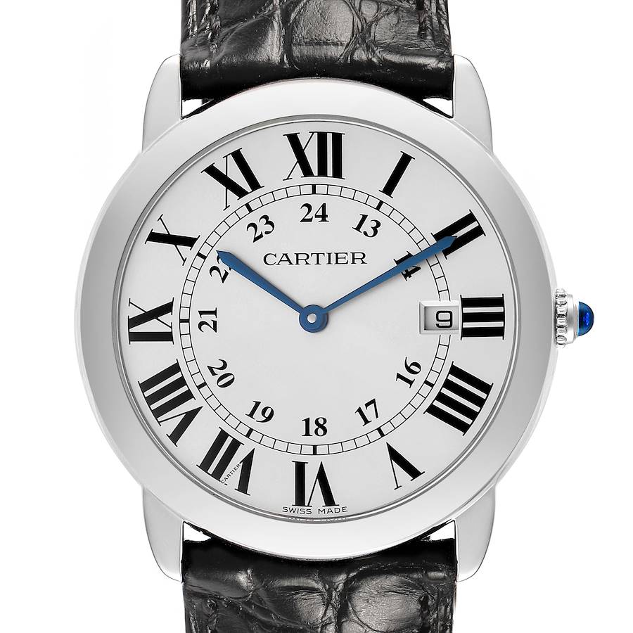 Cartier Ronde Solo Large Steel Silver Roman Dial Mens Watch W6700255 Box Papers. Quartz movement. Stainless steel round case 36.0 mm in diameter. Circular grained crown set with the blue spinel cabochon. . Scratch resistant sapphire crystal. Silver opaline dial with painted black Roman numeral hour markers and an inner minute track with Arabic numeral accents. Blued-steel sword-shaped hands. Secret Cartier signature at VII. Black leather strap with a stainless steel deployant clasp.