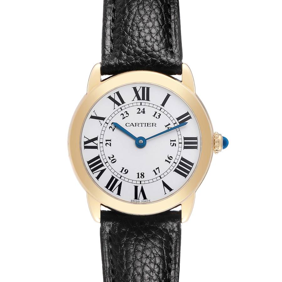 Cartier Ronde Solo Small Yellow Gold Steel Ladies Watch W6700355 Papers. Quartz movement. 18K yellow gold round case 29.0 mm in diameter. Stainless steel case back. Circular grained crown set with a blue spinel cabochon. . Scratch resistant sapphire crystal. Silvered opaline dial with black Roman numeral hour markers and an inner minute track accented with 24-hour time. Blue sword-shaped hands. Secret Cartier signature at X. Black leather strap with an 18K yellow gold tang buckle.