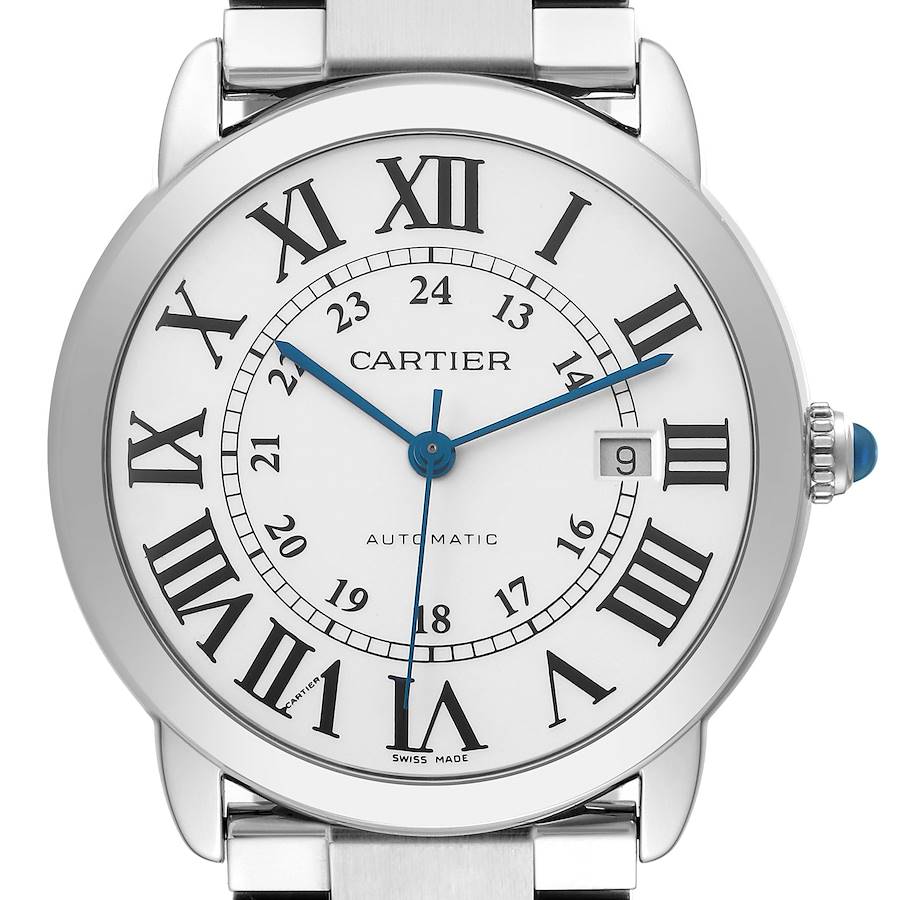 Cartier Ronde Solo XL Steel Silver Dial Mens Watch W6701011. Automatic self-winding movement. Stainless steel round case 42.0 mm in diameter. Circular grained crown set with the blue spinel cabochon. . Scratch resistant sapphire crystal. Silvered opaline dial with black radial Roman numeral hour markers and an inner minute track accented with black Arabic numeral 24 hour display. Secret Cartier signature at VII. Blued-steel sword-shaped hands. Date calendar at the 3 o'clock aperture. Stainless steel bracelet with a hidden double deployant clasp. Fits an 8" wrist.
