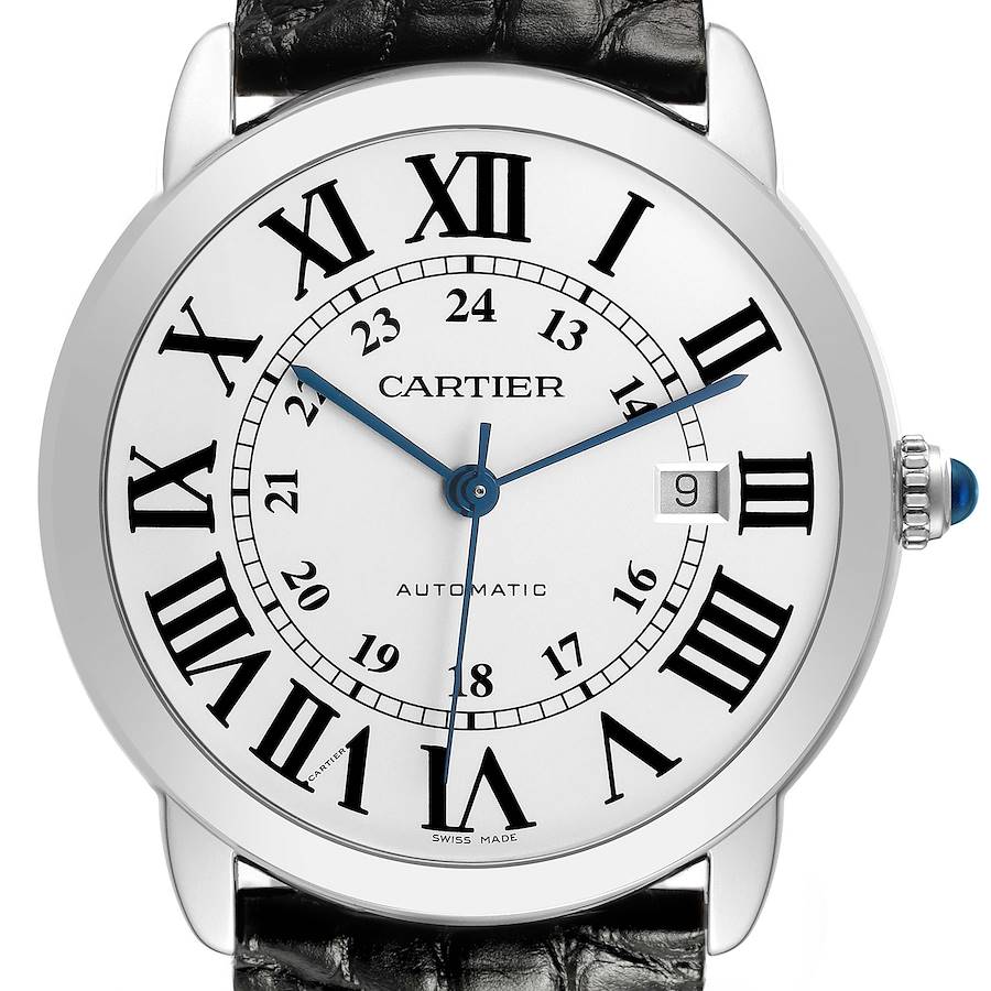 Cartier Ronde Solo XL Steel Silver Roman Dial Mens Watch W6701010. Automatic self-winding movement. Stainless steel case 42.0 mm in diameter. Circular grained crown set with the blue spinel cabochon. . Scratch resistant sapphire crystal. Silvered opaline dial with black Roman numerals. Blued steel hands. Secret Cartier signature at VII. Date calendar window at 3. Black leather strap with stainless steel deployant clasp.