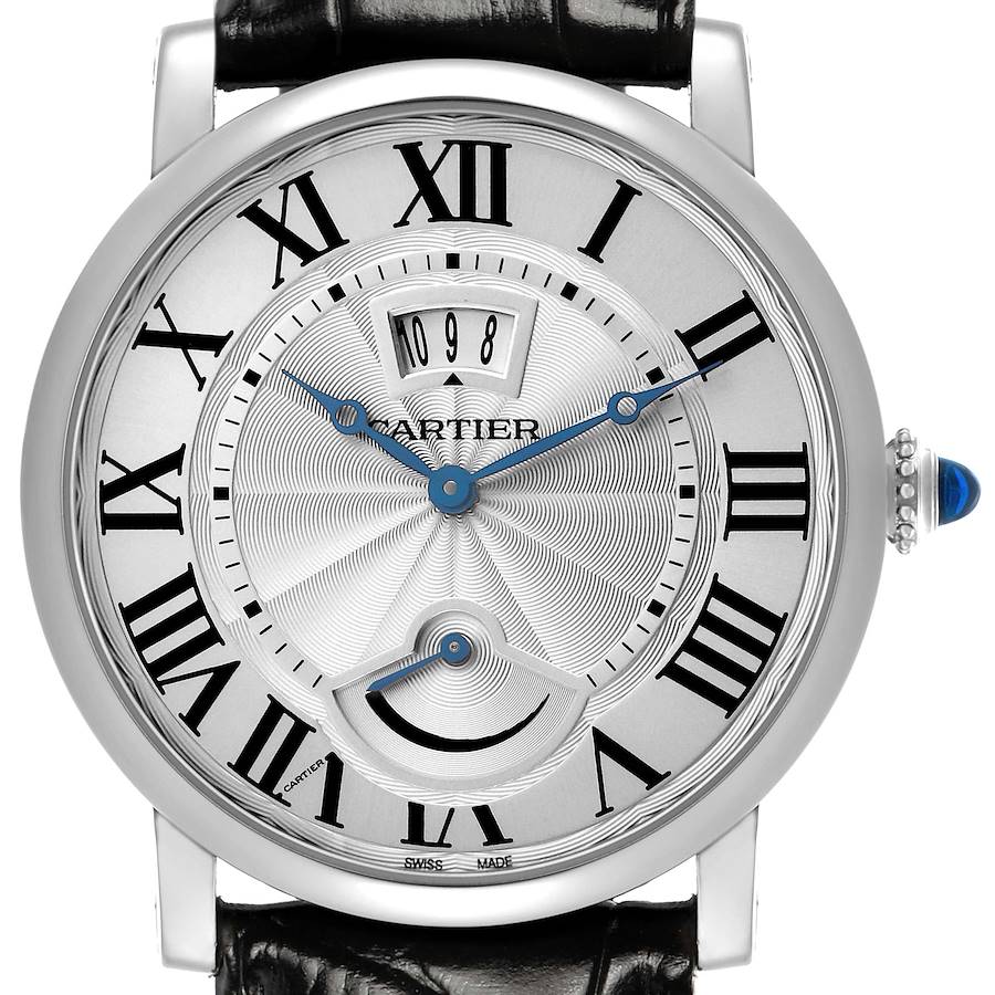 Cartier Rotonde Power Reserve Silver Dial Steel Mens Watch W1556369. Manual winding movement. Stainless steel round case 40.0 mm in diameter. Fluted crown set with a blue spinel cabochon. . Scratch resistant sapphire crystal. Silver guilloche dial with black Roman numeral hour markers and an inner minute track. Blued steel Breguet-style hands. Secret Cartier signature at VII. Date window at the 12 o'clock aperture. Power reserve indicator at 6 o'clock. Black leather strap with a stainless steel deployant clasp.
