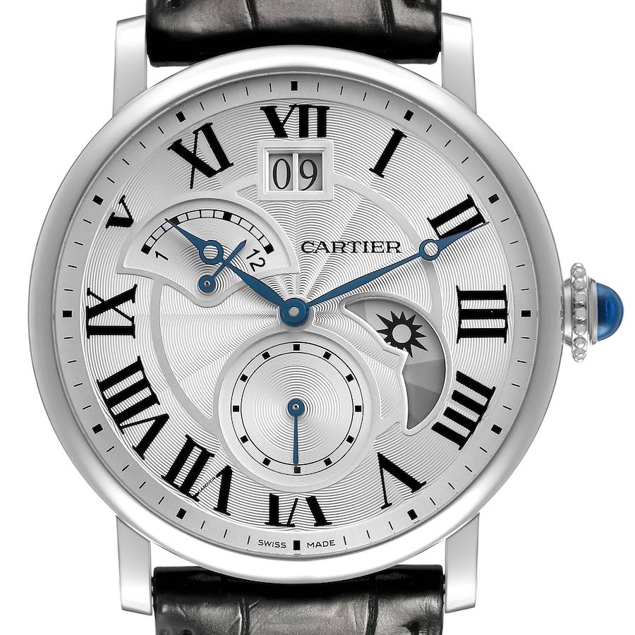 Cartier Rotonde Retrograde GMT Steel Silver Dial Mens Watch W1556368 Card. Automatic self-winding movement. GMT Time Zone, Retrograde. Stainless steel round case 42.0 mm in diameter. Circular grained crown set with the blue spinel cabochon. Transparent exhibition sapphire crystal case back. . Scratch resistant sapphire crystal. Silver guilloche dial with black Roman numeral hour markers and an outer minute track. Blue Breguet-style hands. Secret Cartier signature at VII. Large date double window located below 12 o'clock. Retrograde second time zone located at the 10 o'clock position. Small seconds subdial at 6 o'clock. Day/Night (AM/PM) indicator at 3 & 4 o'clock. Black leather strap with a stainless steel deployant clasp.