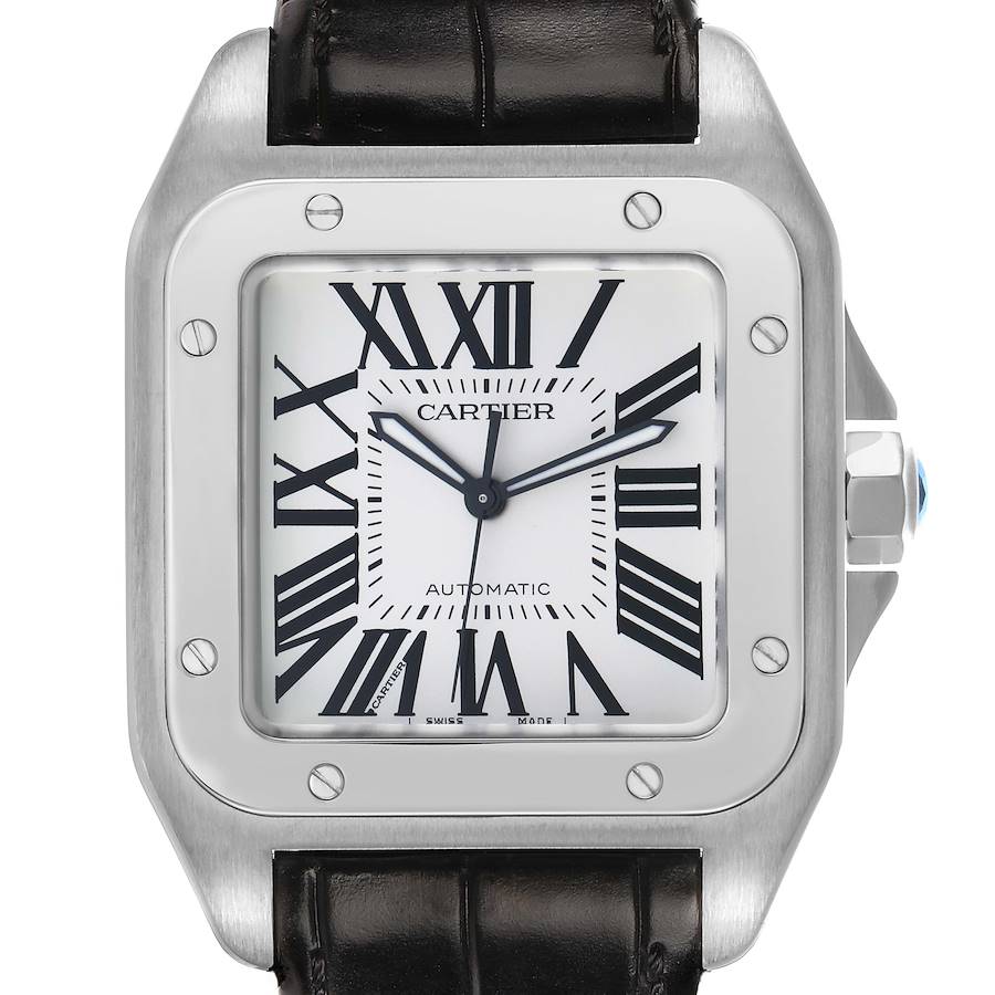 Cartier Santos 100 Large Steel Black Strap Mens Watch W20073X8. Automatic self-winding movement. Stainless steel case 38.0 x 38.0 mm. Protected octagonal crown set with the faceted spinel. Stainless steel bezel punctuated with 8 signature screws. Scratch resistant sapphire crystal. Silvered opaline dial with black radial Roman numeral hour markers. Inner minute track. Luminous sword shape oxidized hands. Secret Cartier signature at VII. Black leather strap with a stainless steel push-button double deployant clasp.