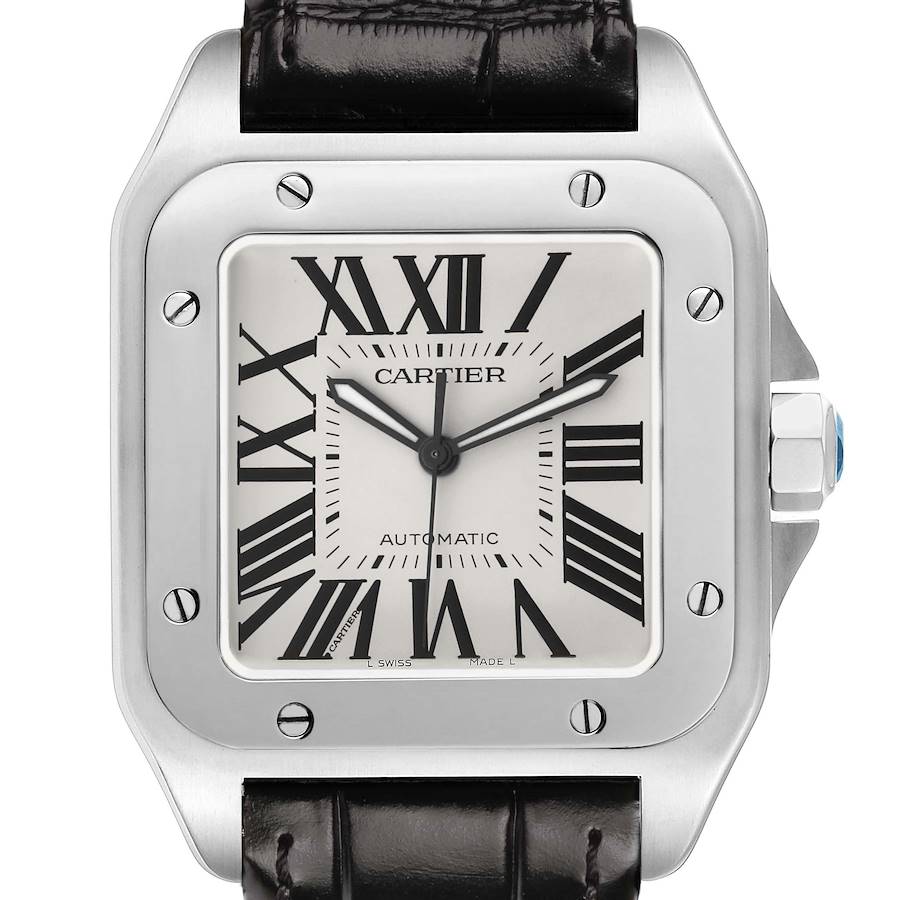 Cartier Santos 100 Large Steel Mens Watch W20073X8. Automatic self-winding movement. Stainless steel case 38.0 x 38.0 mm. Protected octagonal crown set with the faceted spinel. Stainless steel bezel punctuated with 8 signature screws. Scratch resistant sapphire crystal. Silvered opaline dial with black radial Roman numeral hour markers. Inner minute track. Luminous sword shape oxidized hands. Secret Cartier signature at VII. Black leather strap with a stainless steel push-button double deployant clasp.