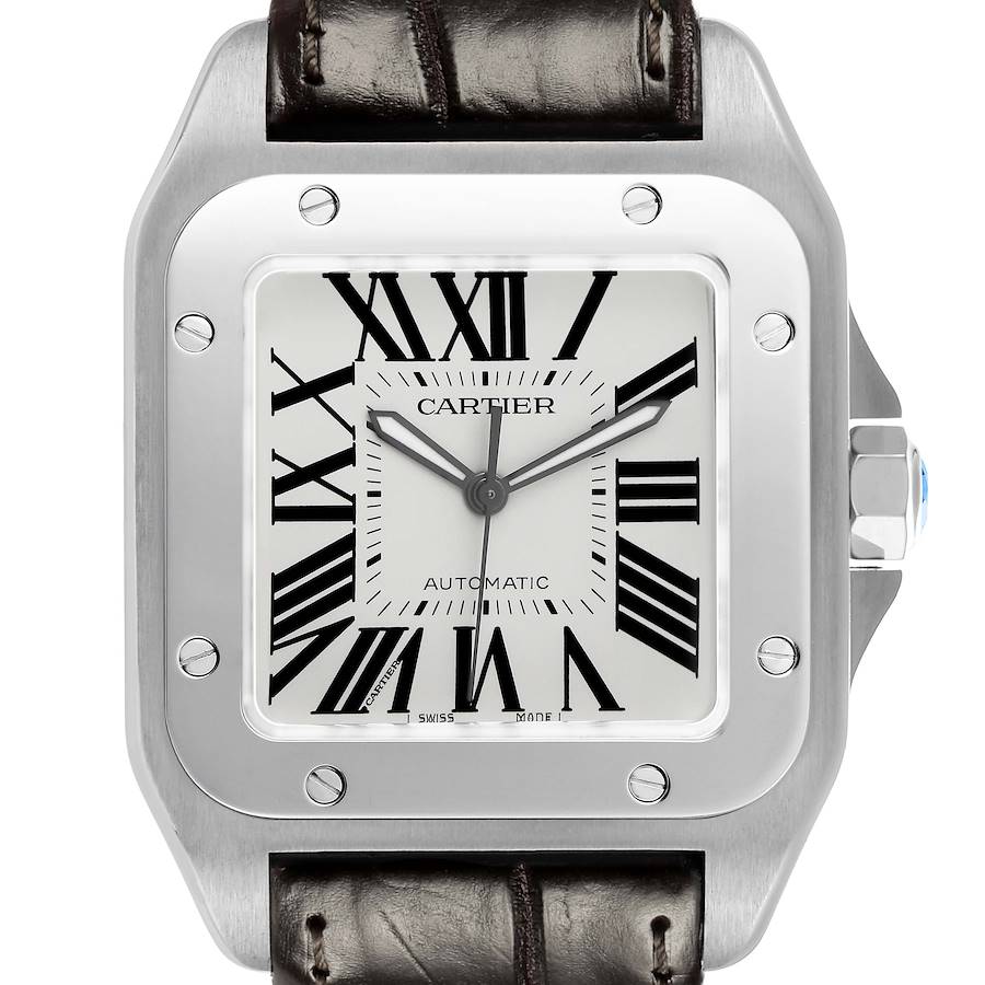 Cartier Santos 100 Large Steel Mens Watch W20073X8. Automatic self-winding movement. Stainless steel case 38.0 x 38.0 mm. Protected octagonal crown set with the faceted spinel. Stainless steel bezel punctuated with 8 signature screws. Scratch resistant sapphire crystal. Silvered opaline dial with black radial Roman numeral hour markers. Inner minute track. Luminous sword shape oxidized hands. Secret Cartier signature at VII. Brown leather strap with a stainless steel double push-button double deployant clasp.