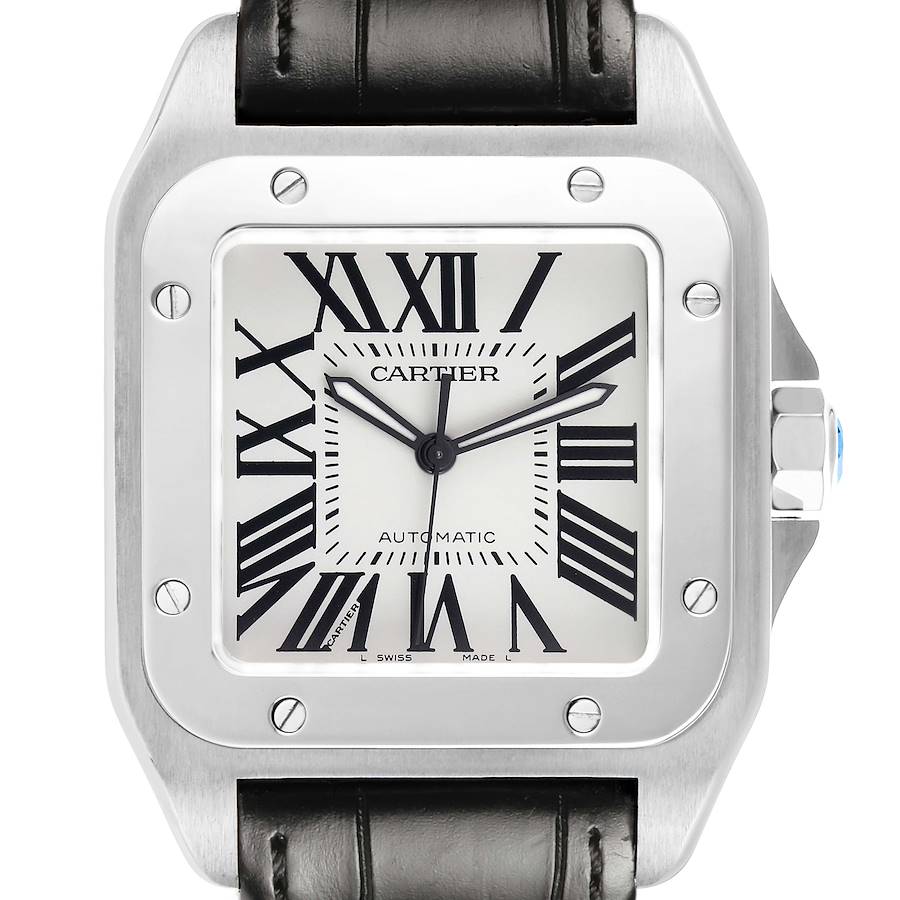 Cartier Santos 100 Large Steel Silver Dial Mens Watch W20073X8. Automatic self-winding movement. Stainless steel case 38.0 x 38.0 mm. Protected octagonal crown set with the faceted spinel. Stainless steel bezel punctuated with 8 signature screws. Scratch resistant sapphire crystal. Silvered opaline dial with black radial Roman numeral hour markers. Inner minute track. Luminous sword shape oxidized hands. Secret Cartier signature at VII. Black leather strap with a stainless steel push-button double deployant clasp.
