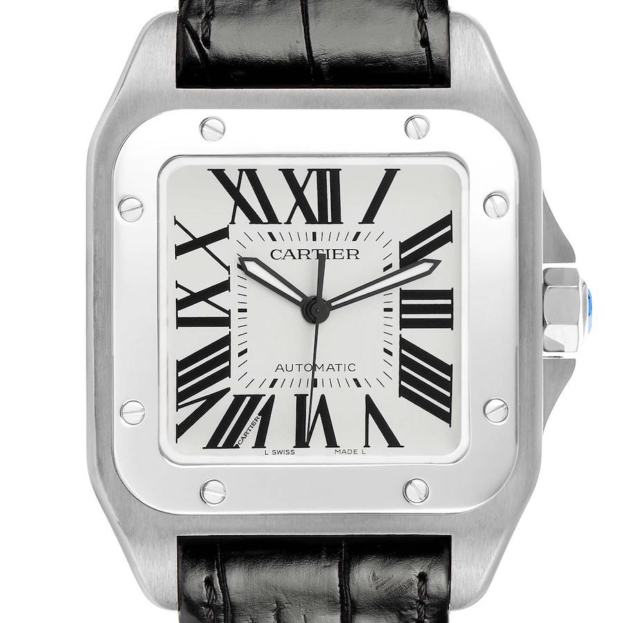 Cartier Santos 100 Large Steel Silver Dial Mens Watch W20073X8. Automatic self-winding movement. Stainless steel case 38.0 x 38.0 mm. Protected octagonal crown set with the faceted spinel. Stainless steel bezel punctuated with 8 signature screws. Scratch resistant sapphire crystal. Silvered opaline dial with black radial Roman numeral hour markers. Inner minute track. Luminous sword shape oxidized hands. Secret Cartier signature at VII. Black leather strap with a stainless steel push-button double deployant clasp.