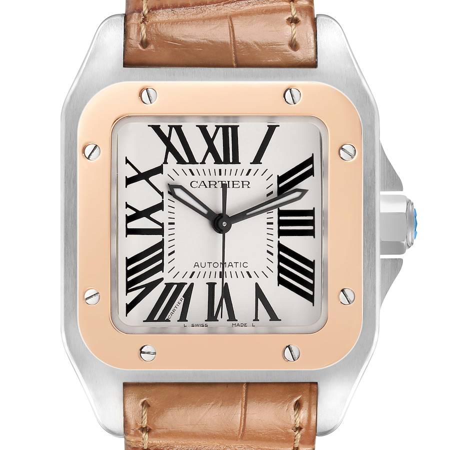 Cartier Santos 100 Midsize Steel Rose Gold Mens Watch W20107X7 Box Papers. Automatic self-winding movement caliber 076. Three body brushed stainless steel case 33.0 mm x 44.2 mm. Protected octagonal crown set with the faceted spinel. 18K rose gold bezel punctuated with 8 signature screws. Scratch resistant sapphire crystal. Silvered opaline dial with painted radial roman numerals. Inner minute track. Luminous sword shape oxidized hands. Secret Cartier signature at VII. Brown leather strap with a stainless steel and rose gold double deployant clasp.