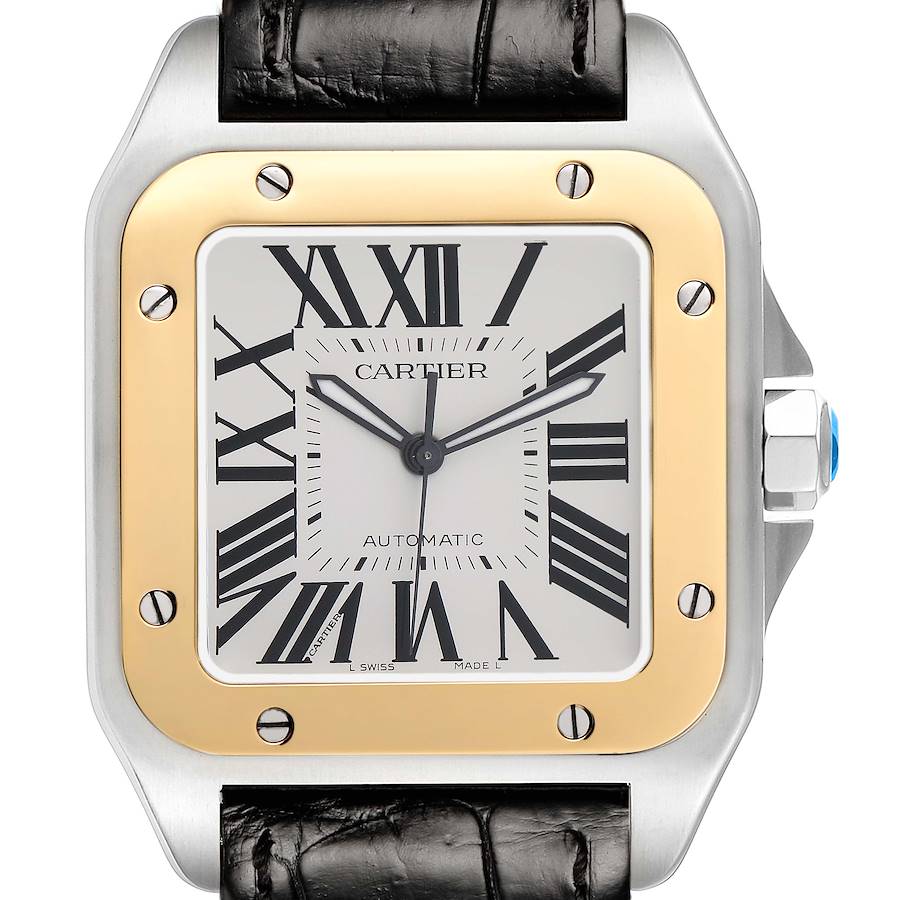 Cartier Santos 100 Steel Yellow Gold Silver Dial Mens Watch W20072X7. Automatic self-winding movement. Three-body stainless steel case 39mm x 51.1 mm. Protected octagonal crown set with a faceted blue spinel. . Scratch resistant sapphire crystal. Silver opalined dial with black radial Roman numeral hour markers and an inner minute track. Luminescent sword-shaped oxidized hands. Secret Cartier signature at VII. Black leather strap with a stainless steel and an 18k yellow gold double push-button double deployant clasp.