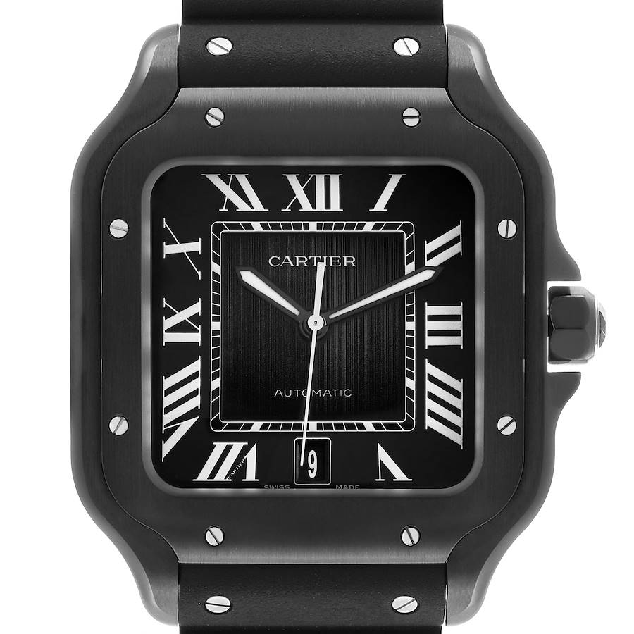 Cartier Santos Dumont Large ADLC Steel Mens Watch WSSA0039 Box Card. Automatic self-winding movement. Black ADLC-coated stainless steel case 39.8 x 39.8 mm. Protected octagonal crown set with a black faceted spinel. Black ADLC-coated stainless steel bezel punctuated with 8 signature screws. Scratch resistant sapphire crystal. Black dial with luminescent radial Roman numeral hour markers and an inner minute track. Luminescent sword-shaped oxidized hands. Secret Cartier signature at VII. Black rubber strap with a stainless steel double push-button deployant clasp.