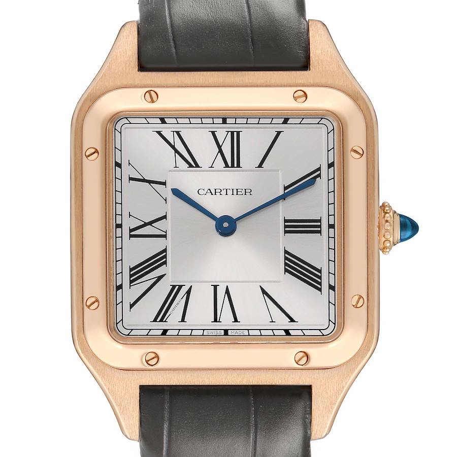 Cartier Santos Dumont Large Rose Gold Silver Dial Mens Watch WGSA0021 Card. Quartz movement. 18k rose gold case 43.5 mm x 31.4 mm. Case thickness 7.3 mm. Circular grained crown set with blue sapphire cabochon. 18k rose gold bezel punctuated with 8 signature screws. Scratch resistant sapphire crystal. Satin-brushed with sunray effect silver dial with black Roman numerals. Sword shaped blued steel hands. Secret Cartier signature at VII. Grey leather strap with an 18k rose gold tang buckle.