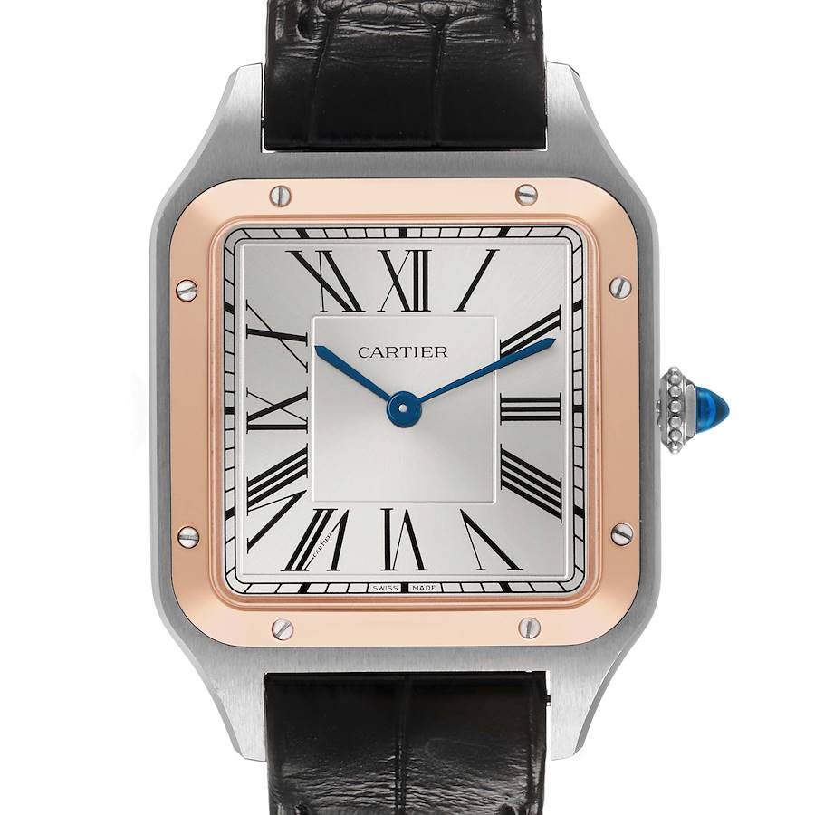 Cartier Santos Dumont Large Steel Rose Gold Mens Watch W2SA0011 Box Card. Quartz movement. Stainless steel square case 43.5 mm x 31.4 mm. Case thickness 7.3 mm. Circular steel beaded crown set with blue spinel cabochon. 18k rose gold bezel with 8 signature screws. Scratch resistant sapphire crystal. Silvered satin-brushed dial with sunray effect. Black radial Roman numeral hour markers and blued-steel sword shaped hands. Outer minute marker track. Secret Cartier signature at VII. Black leather strap with the stainless steel ardillon buckle.