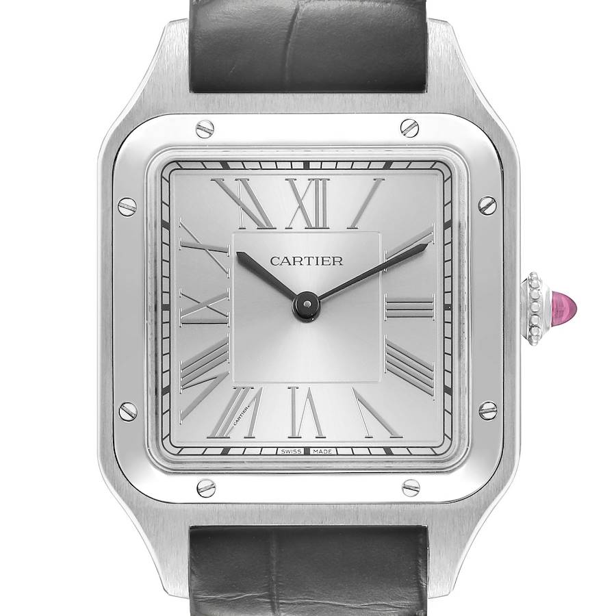 Cartier Santos Dumont Le Bresil Platinum Limited Edition Watch WGSA0034 Box Card. Manual winding movement. Platinum case 43.5 mm x 31.4 mm. Case thickness 7.3 mm. Circular grained crown set with ruby cabochon. Platinum bezel punctuated with 8 signature screws. Scratch resistant sapphire crystal. Platinum square decoration dial with Raised Roman numerals and sword shaped steel hands. Outer minute track. Gray leather strap with a platinum ardillon buckle.
