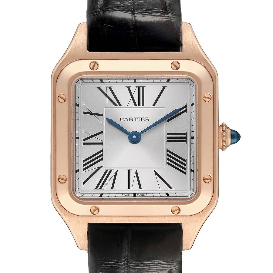 Cartier Santos Dumont Rose Gold Silver Dial Ladies Watch WGSA0022 Card. Quartz movement. 18K rose gold case 38 mm x 27.5 mm. Circular grained crown set with blue spinel cabochon. 18k rose gold bezel punctuated with 8 signature screws. Scratch resistant sapphire crystal. Silver satin-brushed dial with sunray effect. Black Roman numeral hour markers. Sword shaped blued steel hands. Secret Cartier signature at VII. Black leather strap with a 18k rose gold tang buckle.