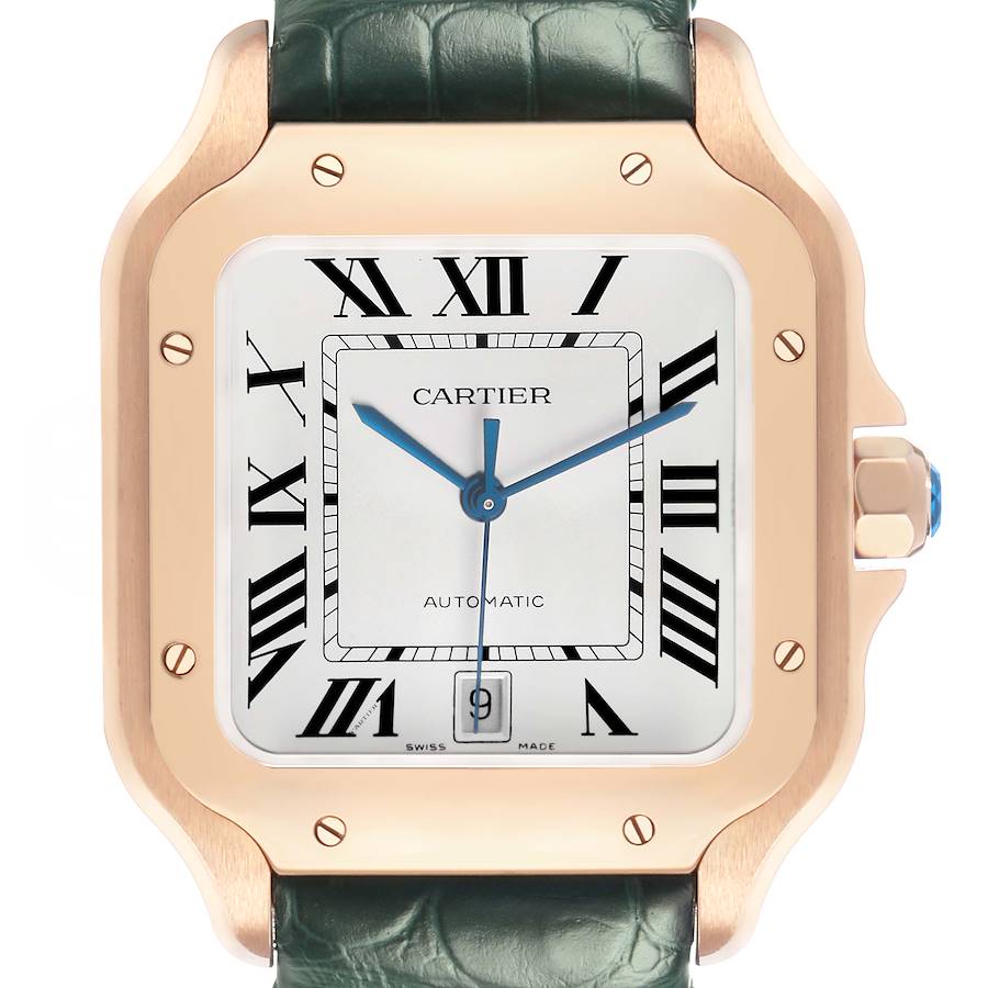 Cartier Santos Large Rose Gold Silver Dial Mens Watch WGSA0011. Automatic self-winding movement. 18K rose gold case 39.8 x 39.8 mm in diameter. Octagonal crown set with the faceted blue sapphire. 18K rose gold bezel punctuated with 8 signature screws. Scratch resistant sapphire crystal. Silver dial with painted radial Roman numeral hour markers and an inner minute track. Sword-shaped blue hands. Secret Cartier signature at VII. Date calendar at the 6 o'clock aperture. Green leather strap with an 18k rose gold folding clasp.