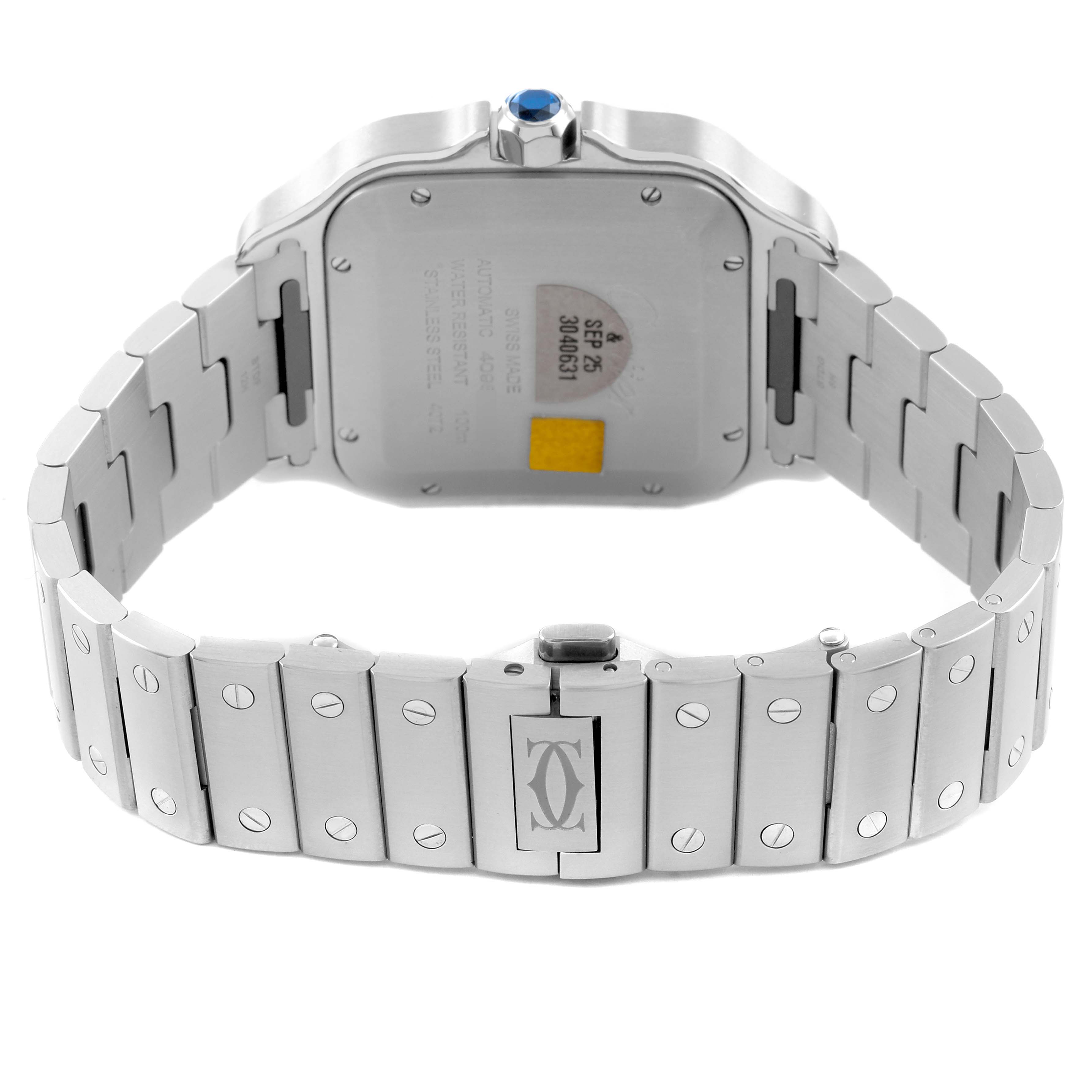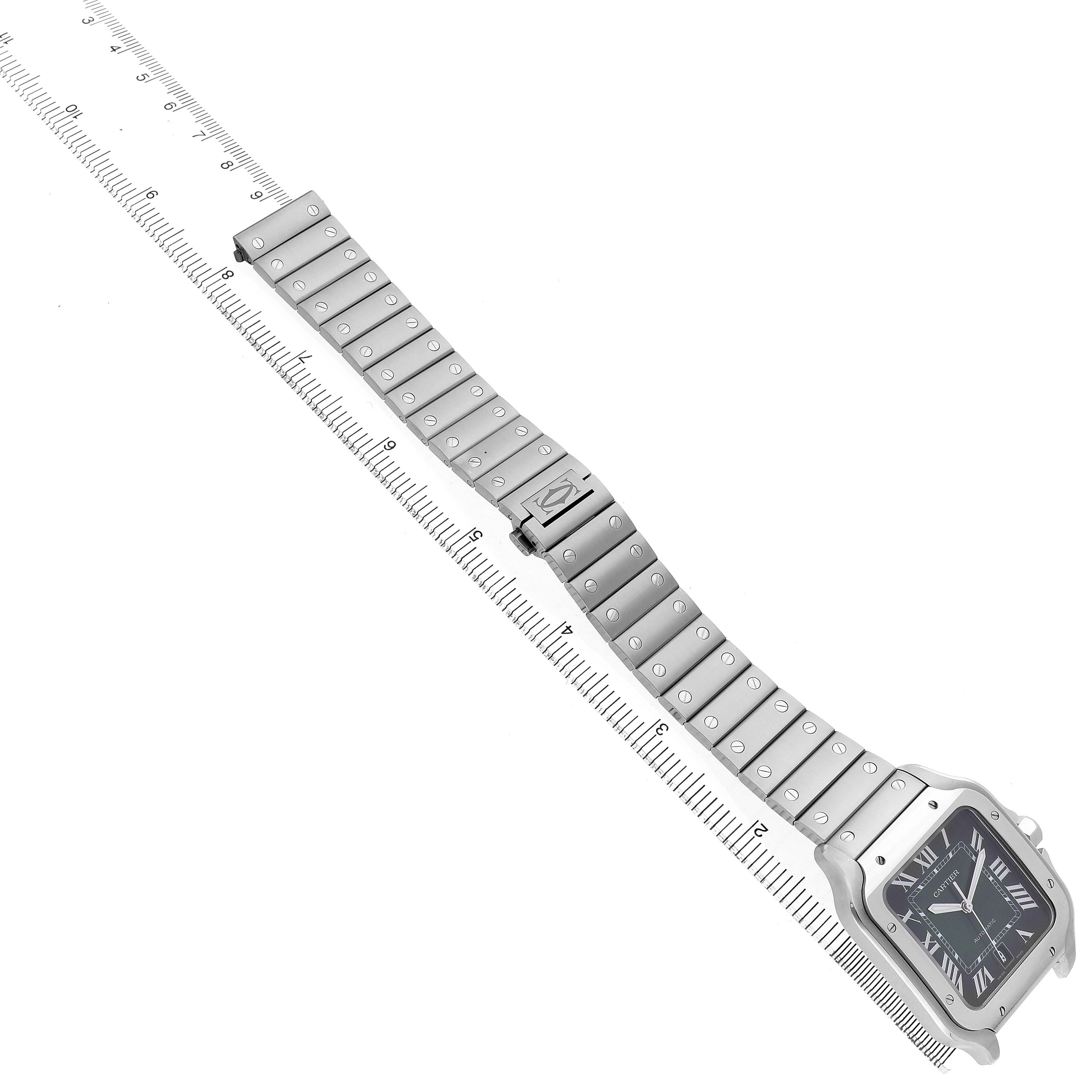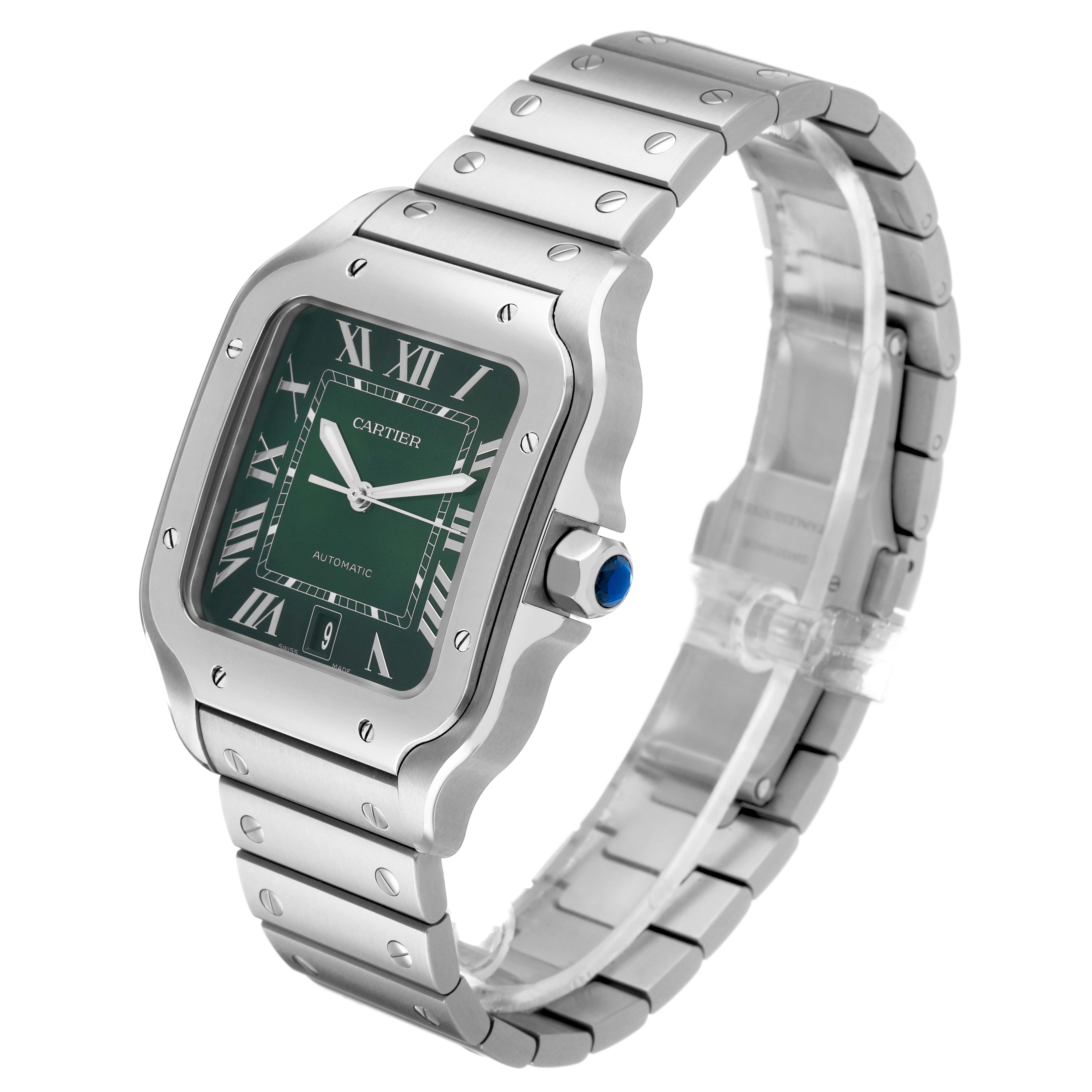 Cartier Santos Large Steel Green Dial Mens Watch WSSA0062 Box Card. Automatic self-winding movement. Stainless steel case 39.8 x 47.5 mm. Octagonal crown set with the faceted blue spinel. Stainless steel bezel punctuated with 8 signature screws. Scratch resistant sapphire crystal. Green dial with radial Roman numeral hour markers and sword-shaped steel hands. An inner minute track. Date window at the 6 o'clock aperture. Stainless steel bracelet with a double push-button deployant clasp. Fits an 8" wrist.