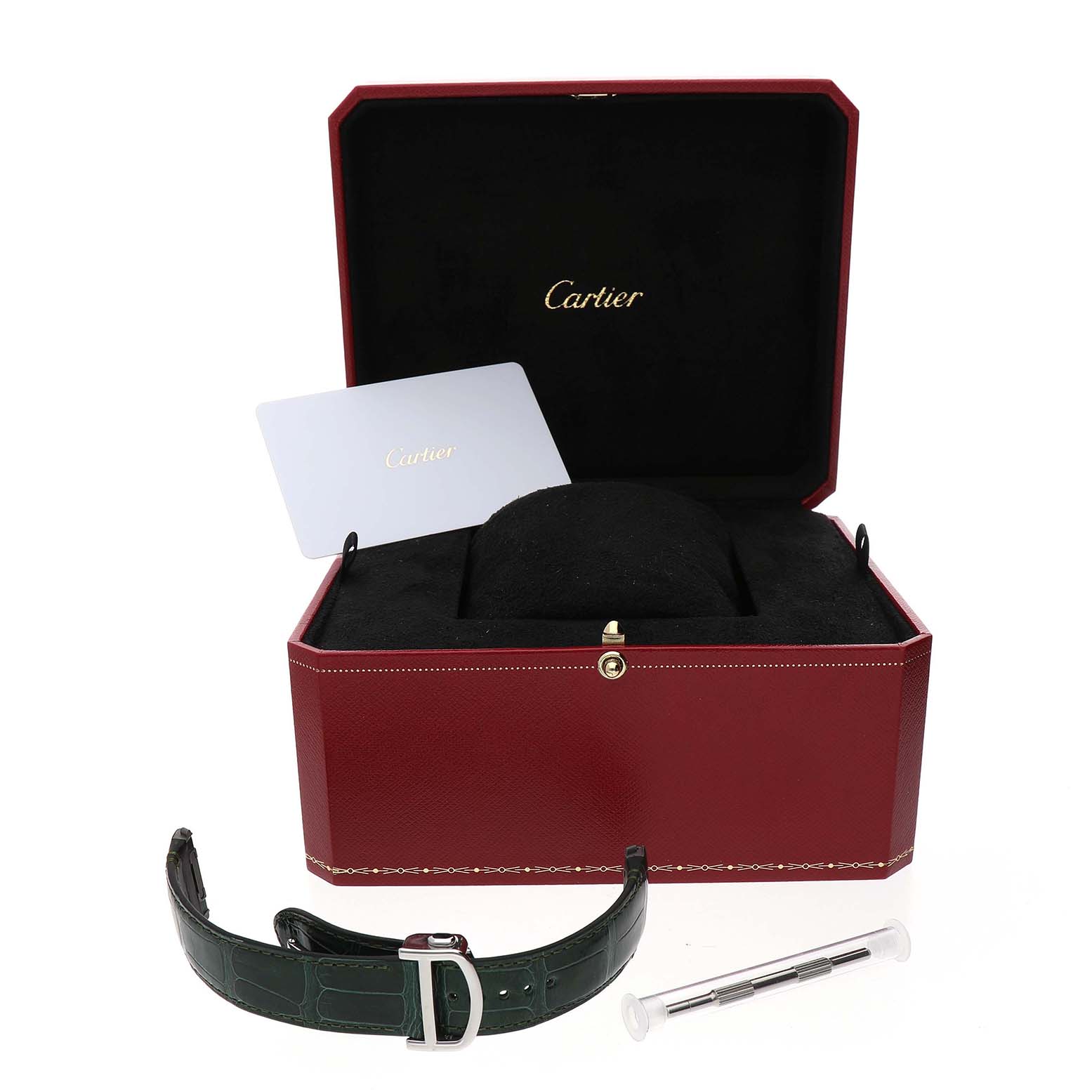 | Box & Papers: | Cartier box and card. Green leather strap with double push-button deployant clasp. Exclusive SwissWatchExpo Certificate of Authenticity. |