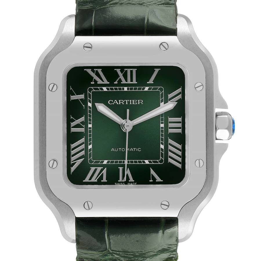 Cartier Santos Medium Steel Green Dial Mens Watch WSSA0061 Box Card. Automatic self-winding movement. Three-body stainless steel case 35.1 mm x 41.9 mm. Protected octagonal crown set with the faceted blue spinel. Stainless steel bezel punctuated with 8 signature stainless steel screws. Scratch resistant sapphire crystal. Green dial with radial Roman numeral hour markers and an inner minute track. Sword-shaped hands. Green leather strap with a double push-button deployant clasp.