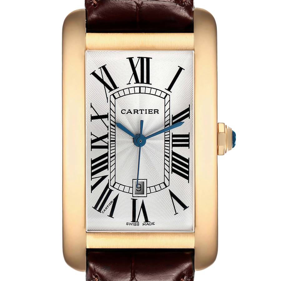 Cartier Tank Americaine Yellow Gold Automatic Mens Watch W2603156 Card. Automatic self-winding movement. 18K yellow gold case 26.6 x 45.1 mm. Octagonal crown set with faceted blue sapphire. . Scratch resistant sapphire crystal. Silvered guilloche dial with black Roman numerals. Date calendar window at 6 o'clock aperture. Custom brown leather strap with 18K yellow gold tang buckle.