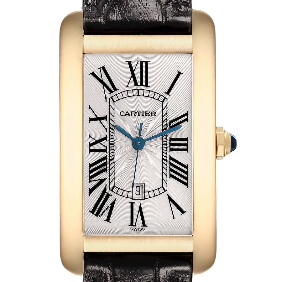Cartier Tank Americaine Yellow Gold Automatic Mens Watch W2603156 Papers. Automatic self-winding movement. 18K yellow gold case 26.6 x 45.1 mm. Octagonal crown set with faceted blue sapphire. . Scratch resistant sapphire crystal. Silvered guilloche dial with black Roman numerals. Date calendar window at 6 o'clock aperture. Black leather strap with 18K yellow gold tang buckle.